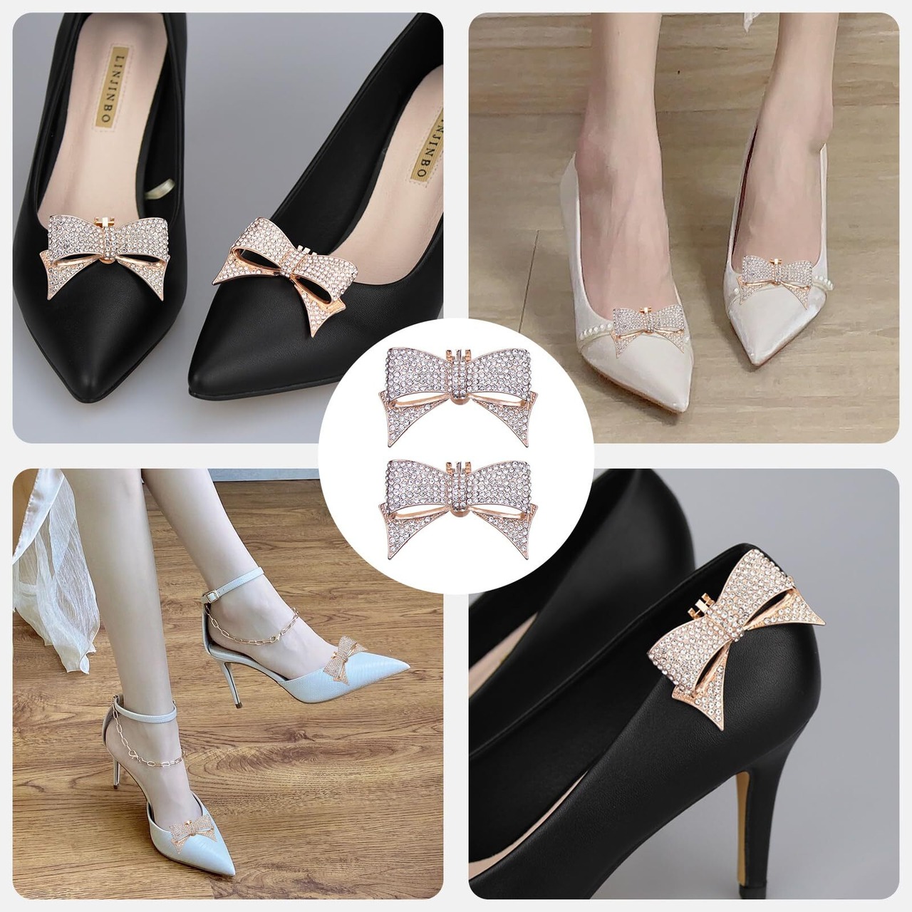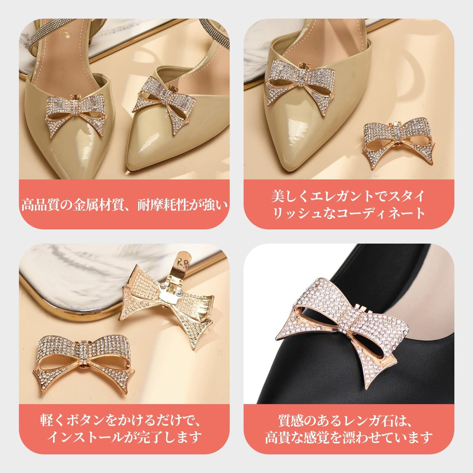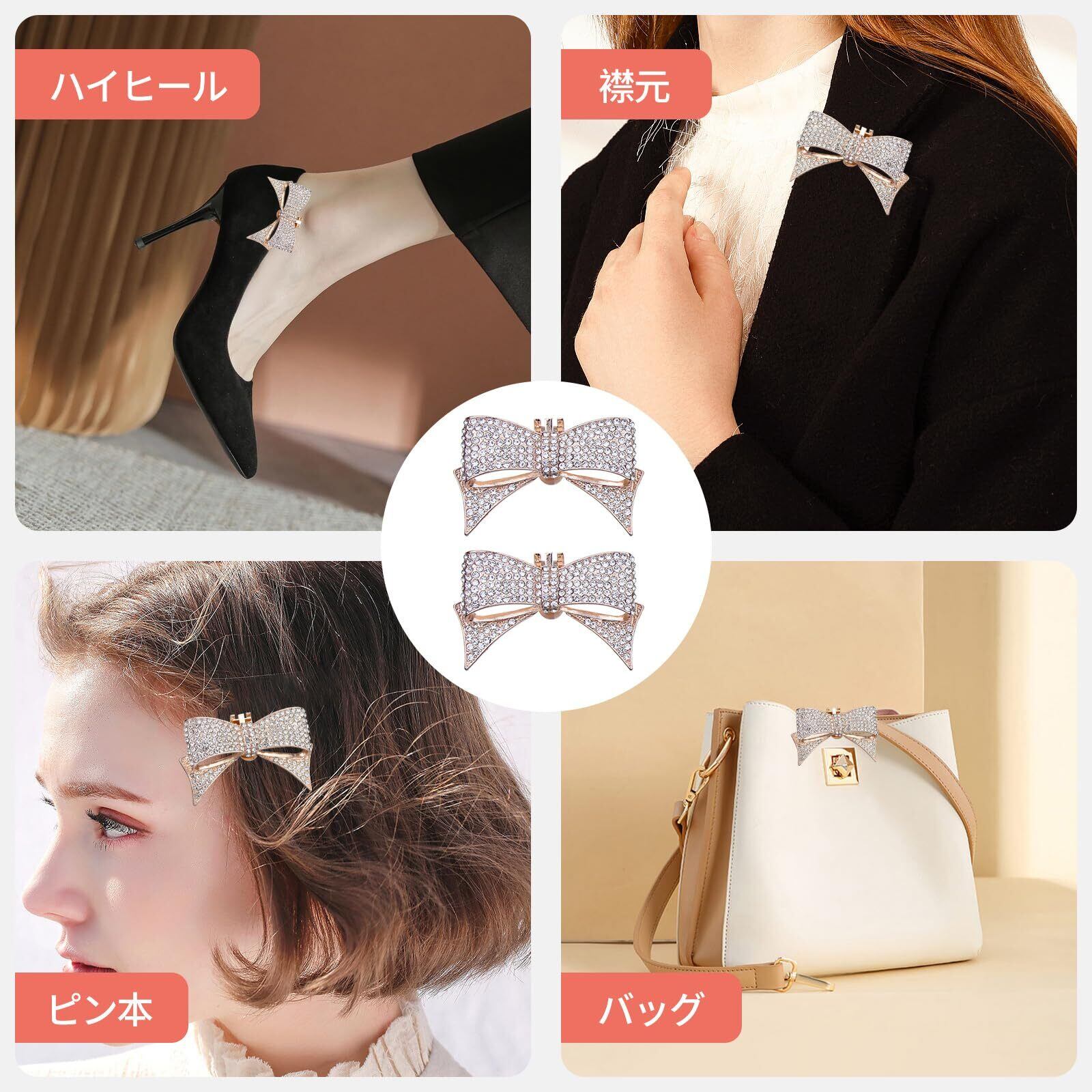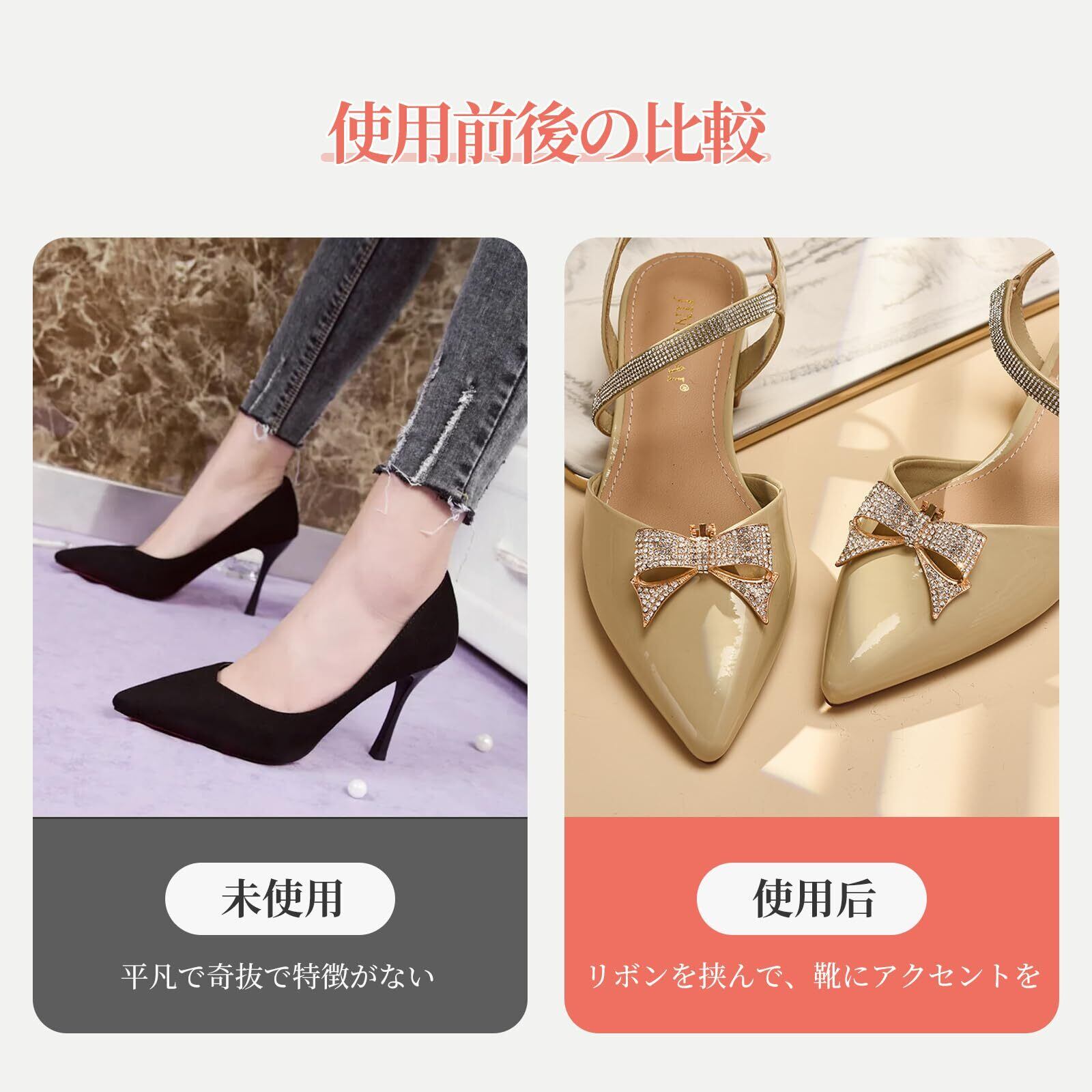 【用途は幅広い】:このシューズクリップちょっとしたお出掛け時やデートの時だけお仕事用のパンプスに付けて活用することも出来るので是非ご検討下さい。急な結婚式やパーティーなどへ出席の時に、また結婚式出席用に新たにヒールを買う余裕のないときなどにも役立ちます。恋人、友達、母の日へユニークな贈り物としてもお勧めです。バッグ、帽子、ストールなどにもお使い頂けま。