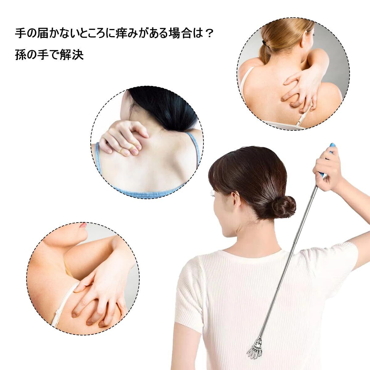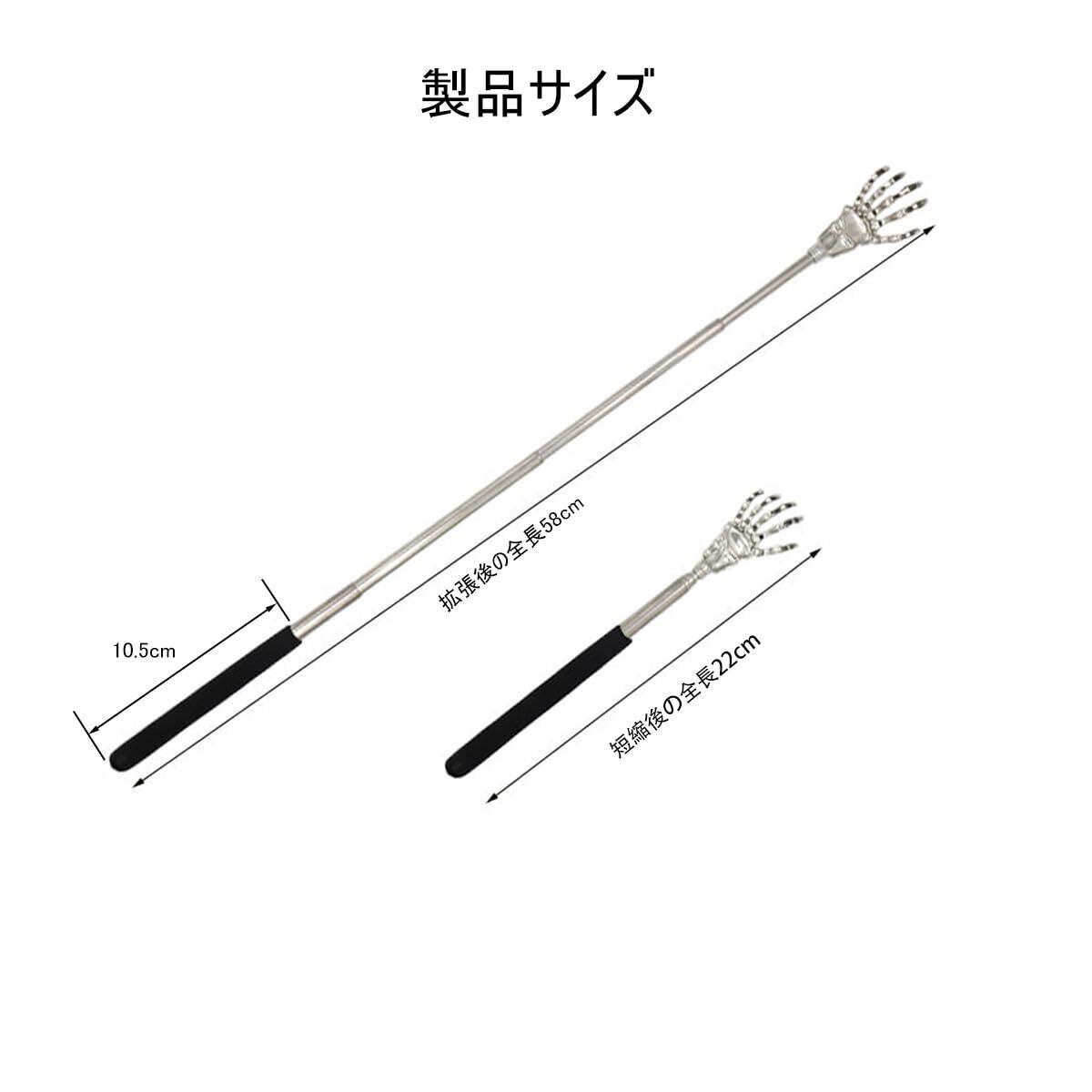 1.[痒い所に手が届く]4段階伸縮で、かゆいところに手が届く!最長約58cmとなり、痒い時に手が届かない場所も、これがあれば楽々と解消。他人の助けは必要ありません。 2.[滑り止め加工]人間工学に基づいて設計されて、ハンドルは合成ゴム製の滑り止め加工で、持ち心地がよく、持ち運びも簡単です。 3.[肌を傷つけない]5本の指で構成された熊手タイプなので、一度に広範囲をかけることができ、先端は尖っておらず、肌を傷つける心配がありません。ちょうど良いかき心地を堪能できます。 4.[耐久性優れた]良質なステンレス鋼で作られているため、丈夫で耐久性があり、錆びたり曲がったり、割れたりしない。 5.[伸縮自由可能&収納簡単]収縮時約22cm 伸長時約58cm、伸縮自由なので、鞄の中に入れて、畳んで旅行にも持って行けますから、かゆくなったらいつでも使えます。日常生活、野外散歩、学校、旅行、休日としても最適です 敬老の日や大切なご家族への贈り物に最適です。
