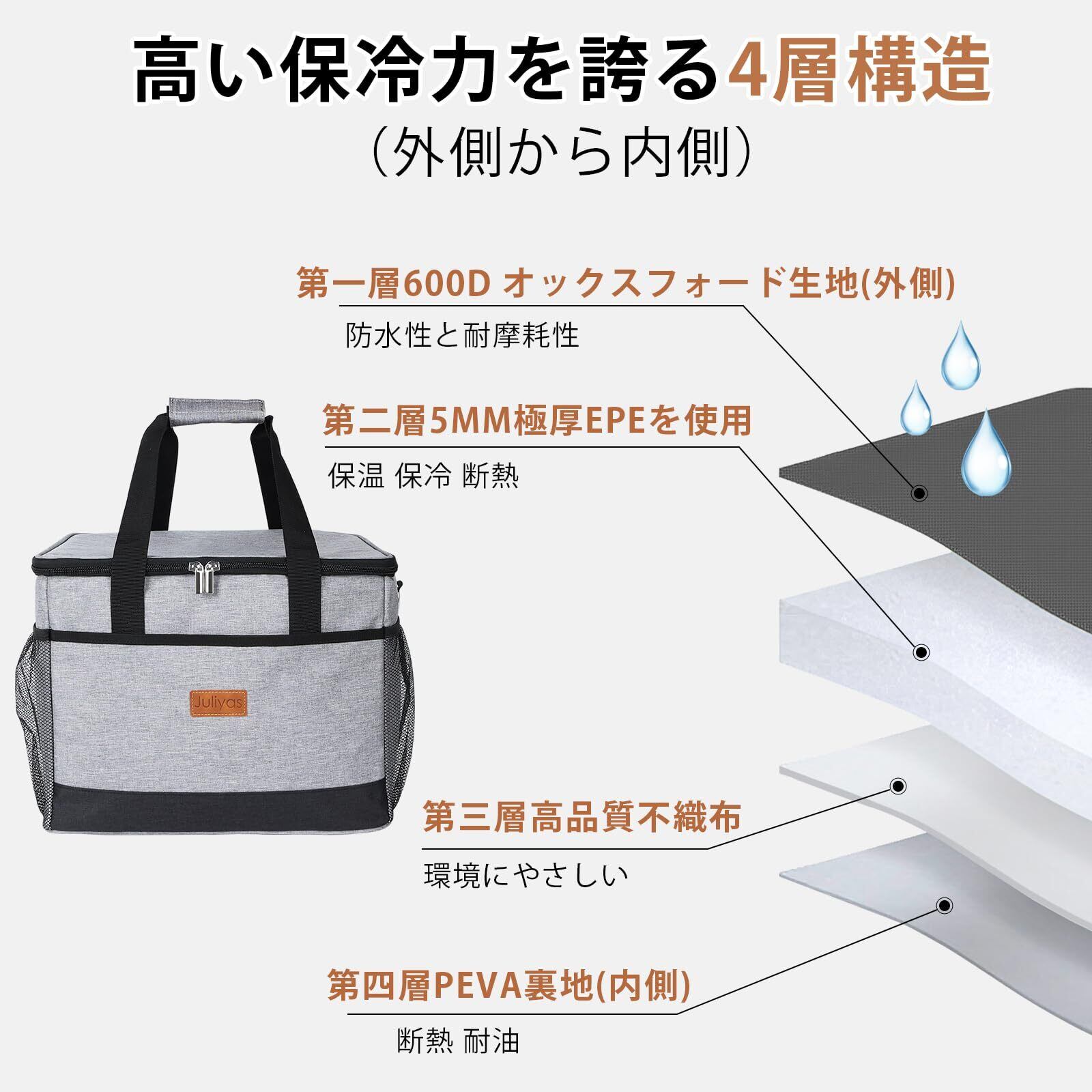 特徴 30L大容量/折り畳み式/優れた4層断熱材/軽量持ち運び可能/収納可能/冷蔵・保鮮・保温多機能/ 防水耐久性ある