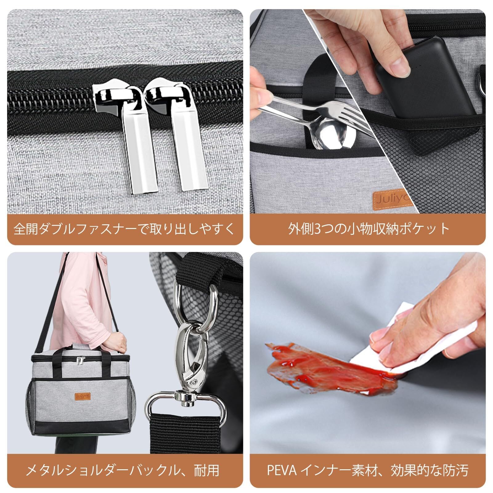 【長時間保温の秘密ー4層の高品質断熱材】 クーラーボックスの外層は600Dオックスフォード素材で作られており、防水性、耐摩耗性があり、色あせしにくいです。第二層5MM極厚EPE材質、保温性、 保冷性、 断熱性が優れた 。第三層は高品質不織布環境にやさしい、第四層PEVA裏地、内部のアルミ箔インターフェースはホットプレスプロセスを採用しており密閉性が 優れた。耐久性や機能性に優れたクーラーバッグです。4層構造により、保冷のみならず、冷蔵+保鮮など今までにない組み合わせでの使用が可能です。