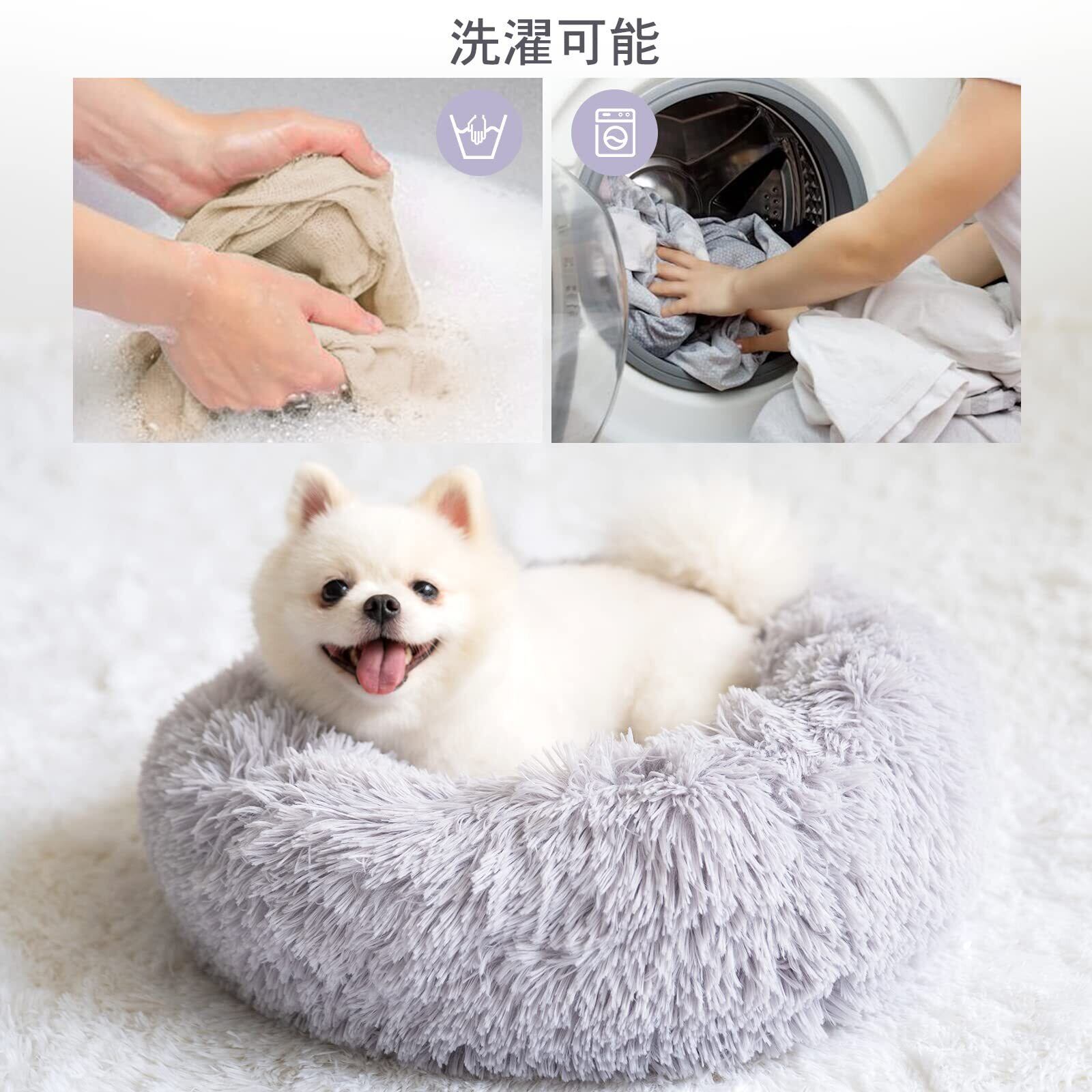 猫 ベッド 犬ベッド ふわふわ ラウンド型 ペットクッション 通年 滑り止め 防寒 暖かい 洗濯可能 子犬 猫用 サイズ選択可 カラー選択可 (50cm, ライトグレー/取り外し可能)