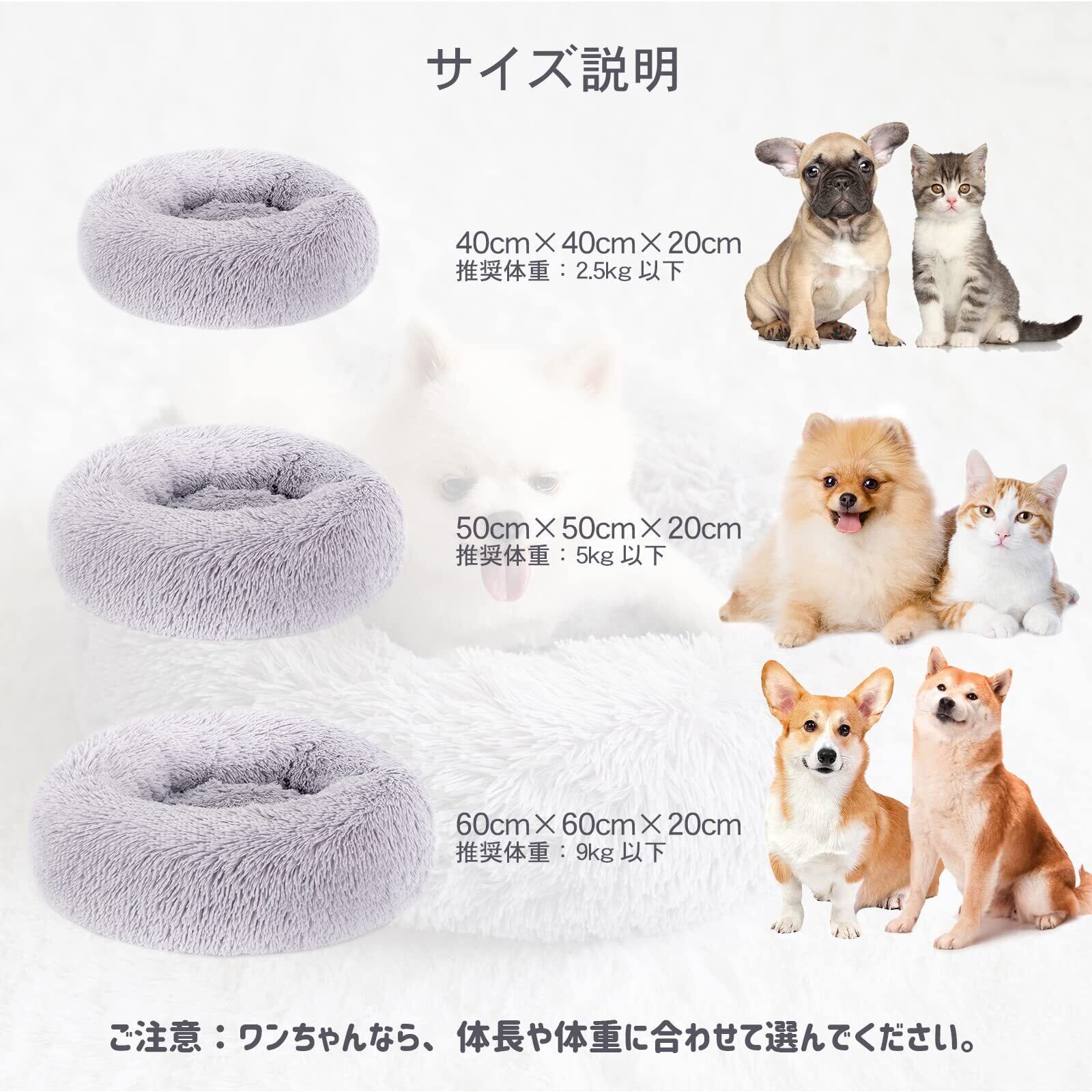 【商品仕様】サイズ:直径50cm 高さ:約20cm (推奨体重5Kg以下)、素材:ふわふわして暖かいPP綿で填充+4cm長毛フランネル(弾力性抜群な立体綿をたっぷりと使用。押しても型崩れしにくいです。)