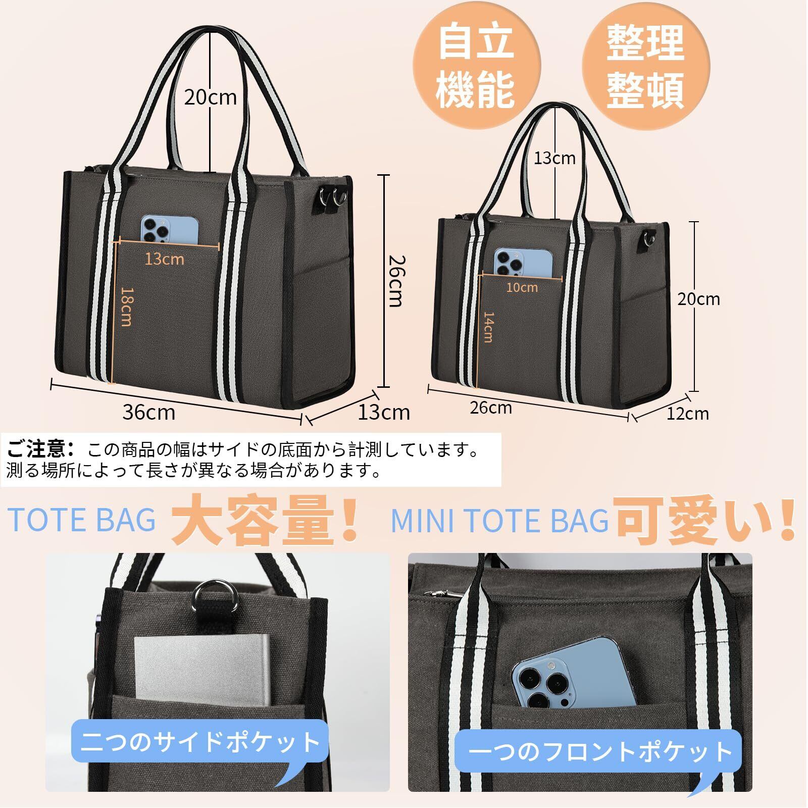 サイズ:Lサイズ:長さ36 ㎝ 幅13 ㎝ 高さ27 ㎝、重さ:0.55 kg。Sサイズ:長さ26 ㎝ 幅12 ㎝ 高さ20 ㎝、重さ:0.4 kg。LサイズのトートバッグはA4サイズの書類と13インチPCを収納できて、通勤と通学が似合います。Sサイズのトートバッグは可愛くて、ちょっと出かけ時に必要なスマホーと財布などの小物を収納できます