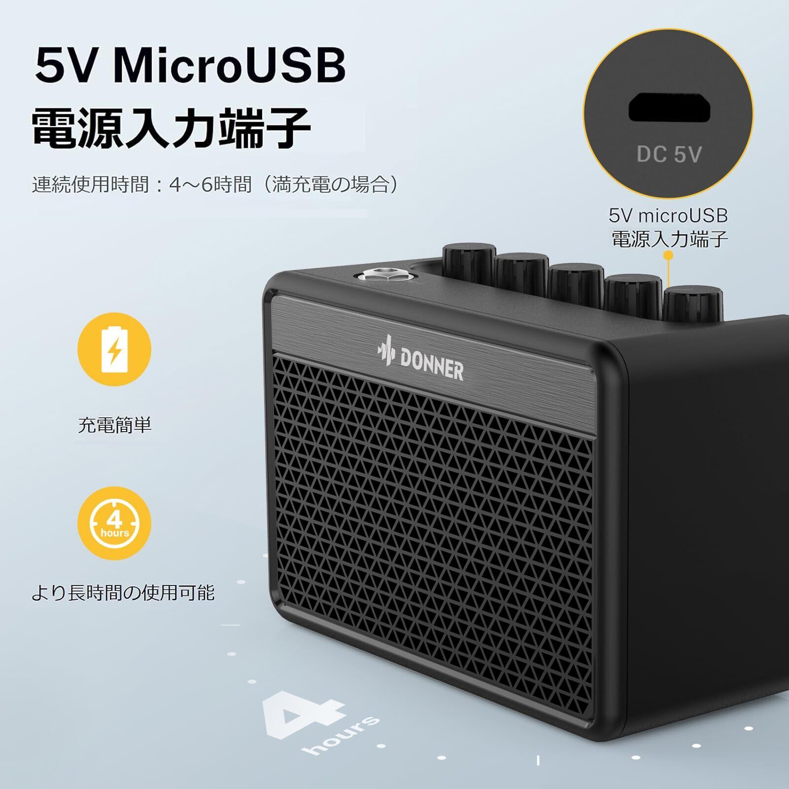 【充電式】本体に差しておくだけで充電でき、出力は5Wで最大4時間の連続使用が可能で、場所を問わずにギター演奏を楽しむことができます