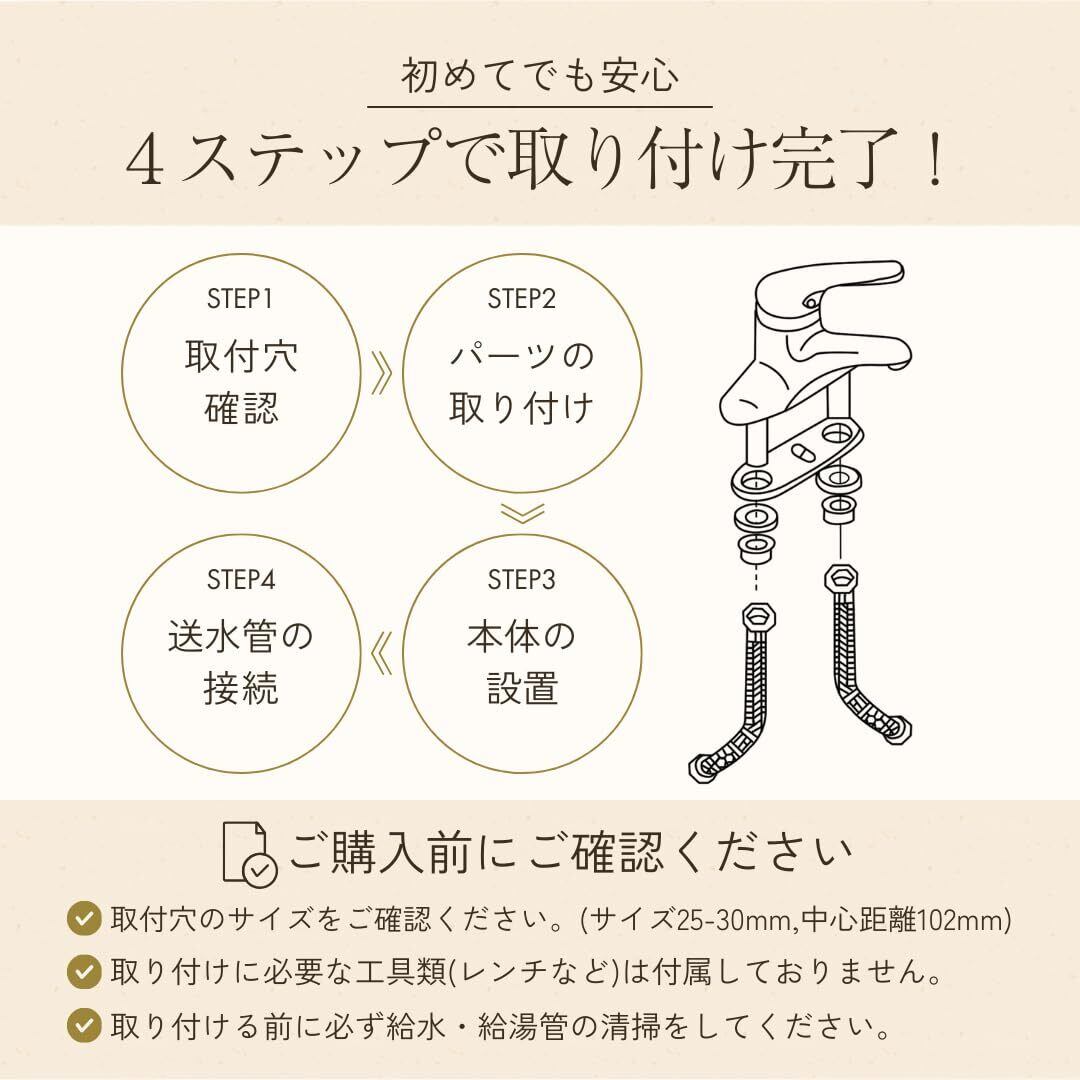 【簡単DIY取付】本体をナットで固定し、付属の冷温水ホースを接続するだけの簡単施工。取付2穴中心距離約100mm、取り付けネジ径約20mmの一般的な規格に対応しています。