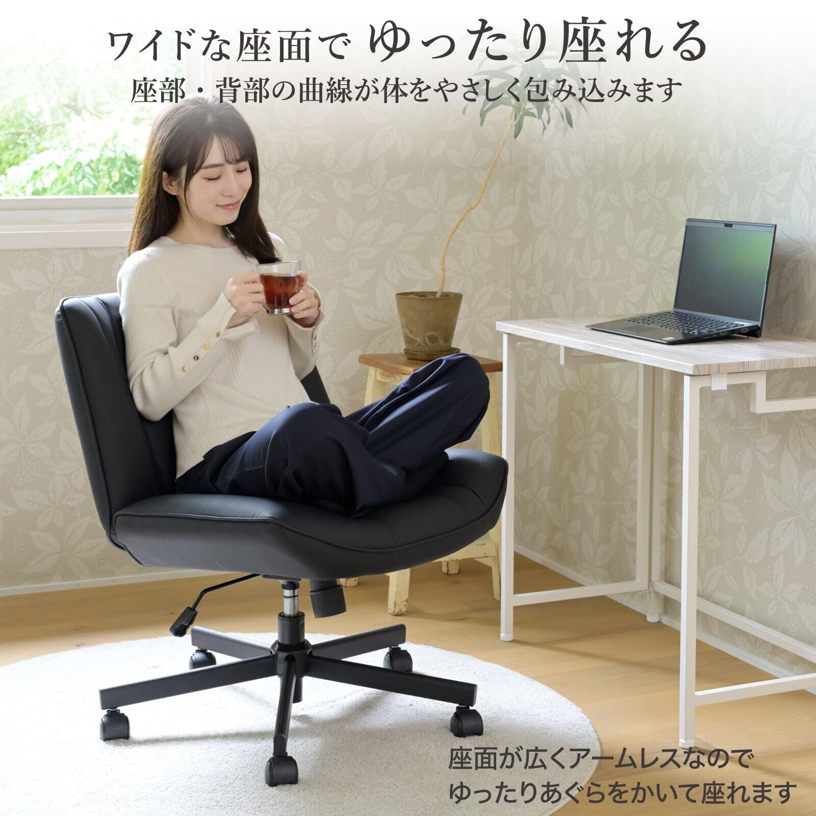 【あぐらがかける】座面がゆったり広く、肘なしなのであぐらがかきやすいソファのようなチェアです。座部・背部の曲線がやさしく体を包みこみ、体をサポートします。