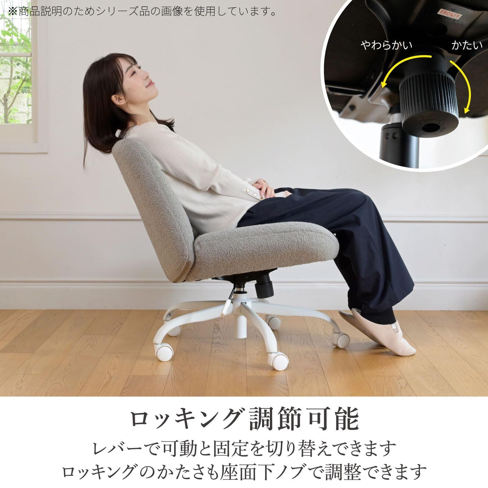【ロッキング機能付き】ロッキングの可動と固定はレバー操作で切り替えられ、またロッキングのかたさは座面下のノブで調整できます。作業中にリラックスしたいときなど、シーンに合わせて変えられます。