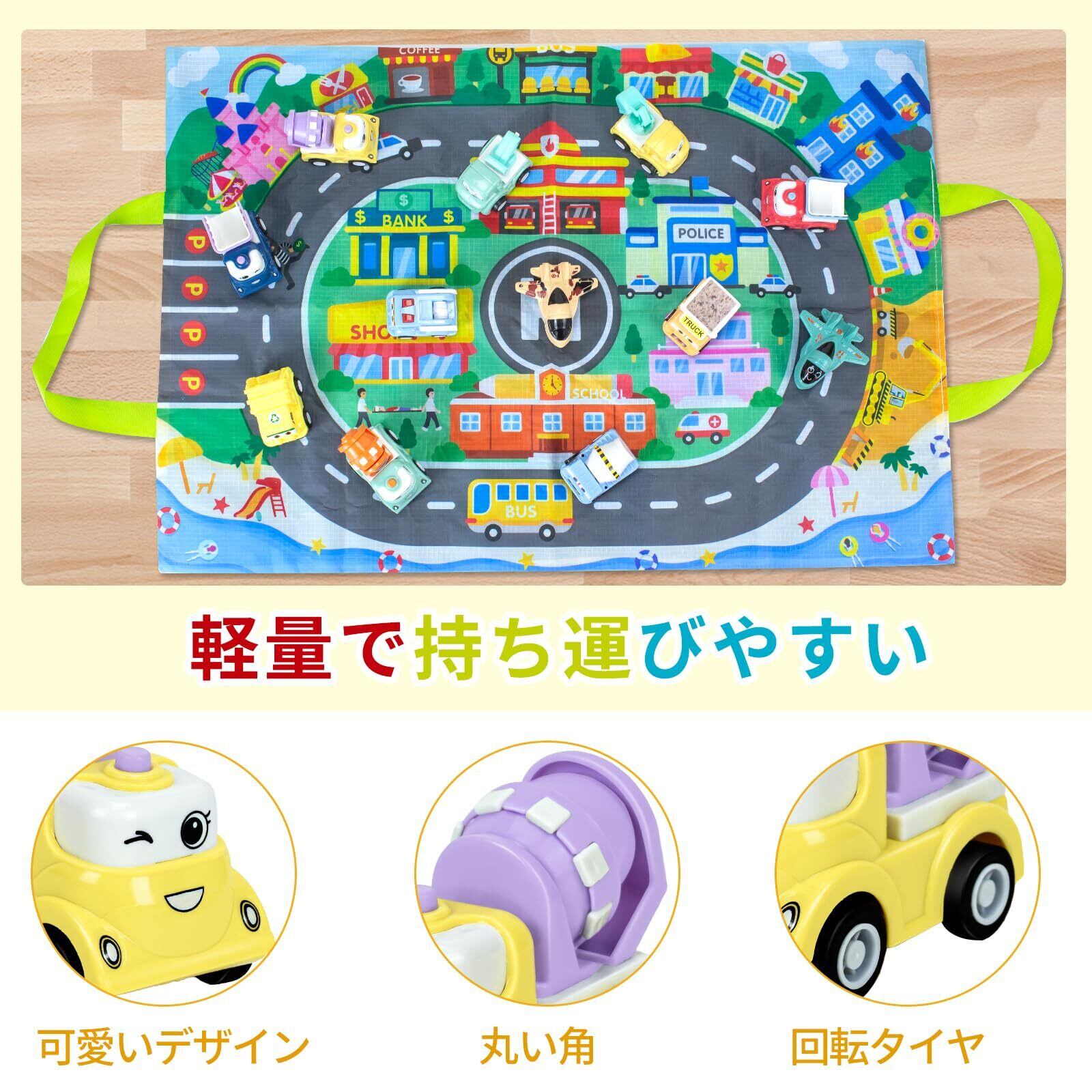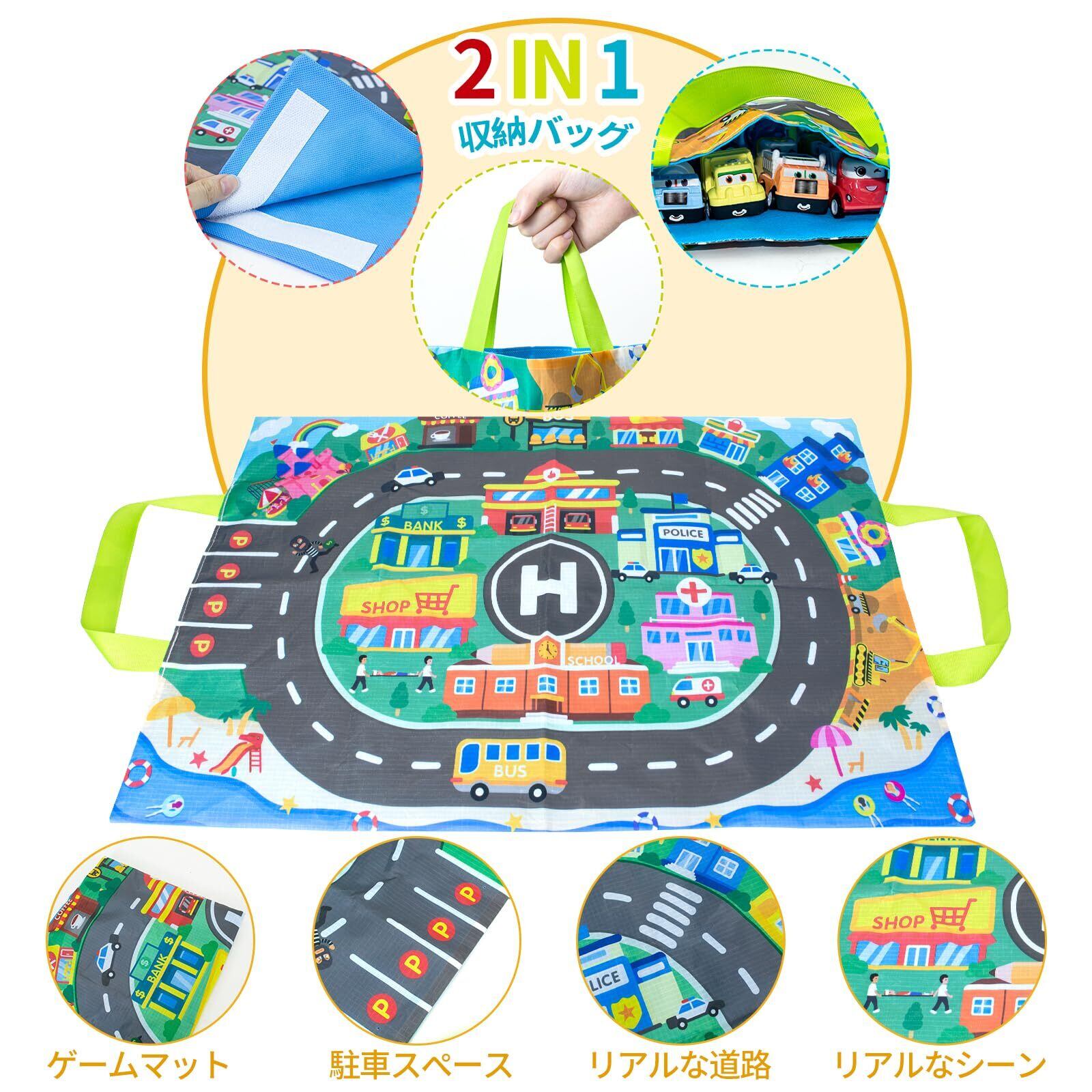 【2IN1カーマット】収納バッグにも、プレイマットにもなります。地図や情景部品も付いていて、柔らかい不織布でできています。12台の車おもちゃをセットして、子供が車を遊ぶとき、収納バッグを広げて、車のゲームマットになります。