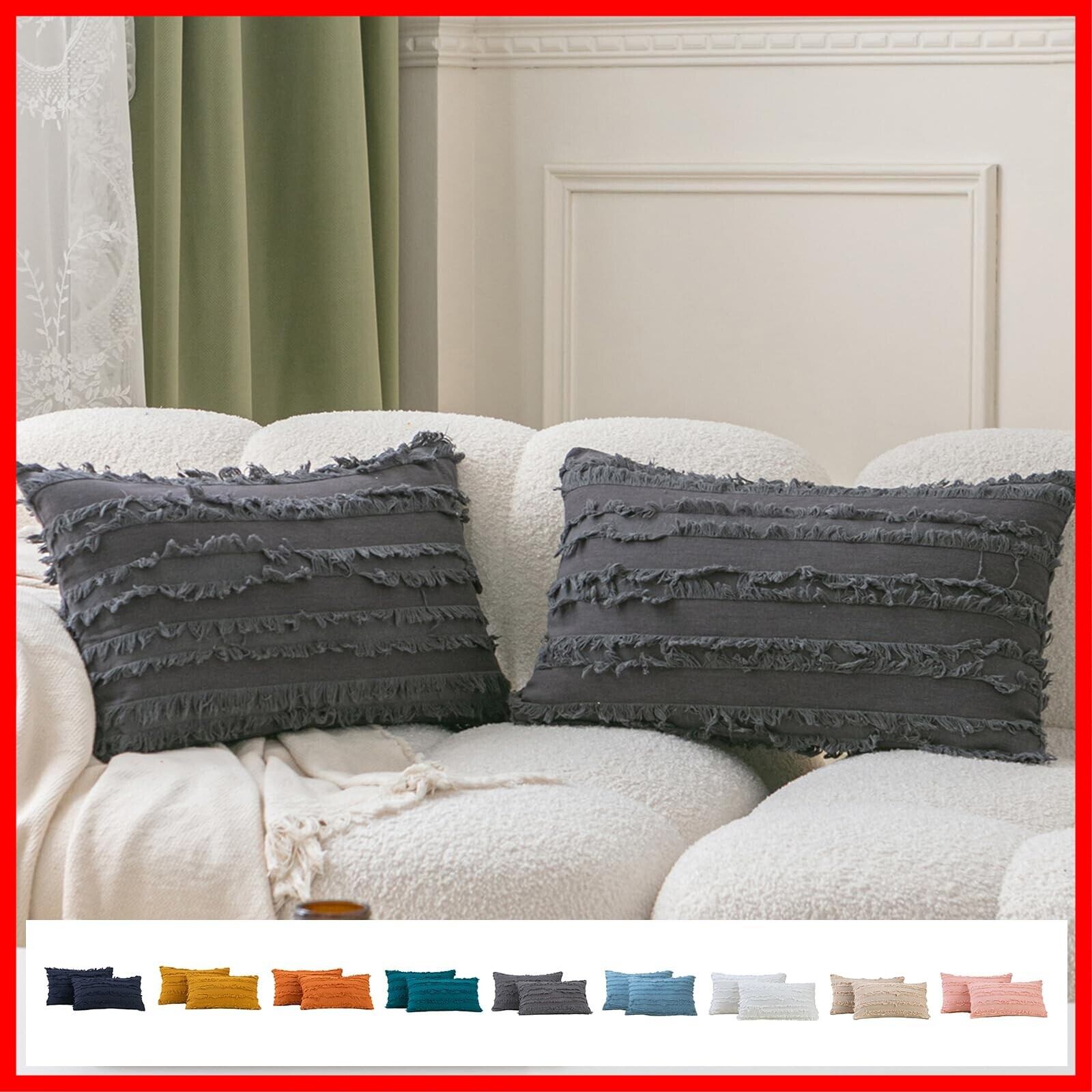 UlikTree クッションカバー 30cmx50cm 2枚セット ストライプ タッセル フリンジ お洒落 柔らかい 北欧風 グレー