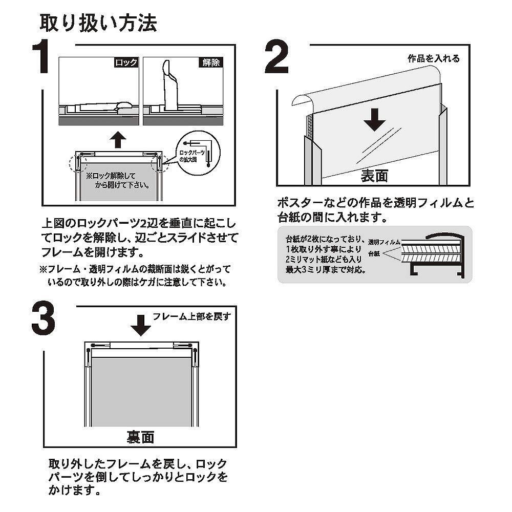 細身なシンプルデザインでありながら、ハイエンドモデルのクオリティをあわせ持つアルミフレームです。特にポスターなどを飾るのに最適です。ポスターの他にも、中台紙を1枚はずすだけで最大3mm厚まで対応。作品の出し入れは、コインで回せるネジ2個をゆるめるだけ。タテヨコどちらでも使用出来ます。吊下げ用のヒモ付属。