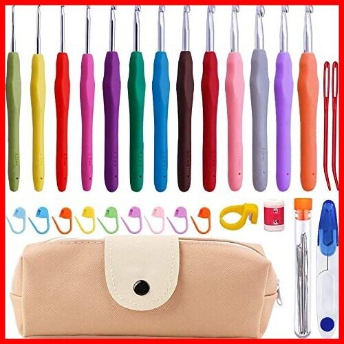 かぎ針セット内容: 13*編み針、10*段数マーカー、1*ハサミ、1*目数段数計、9*縫い針、2*なわあみ針、1*PUバッグ、1*カッター。編んだ時に余計な引っ掛かりがなく、初心者でもスムーズに編むことのできます。