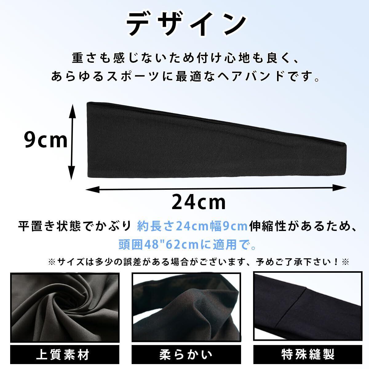 ■【ヘアバンド仕様】 サイズ(平置き):約24cm×9cm(フリーサイズ)。頭囲45-62cmに適しています。サラッとした素材ですので、肌が擦れて痛くなりにくいです、あらゆるスポーツに最適なヘアバンドです。男性だけでなく、女性も使用できるヘッドバンド。