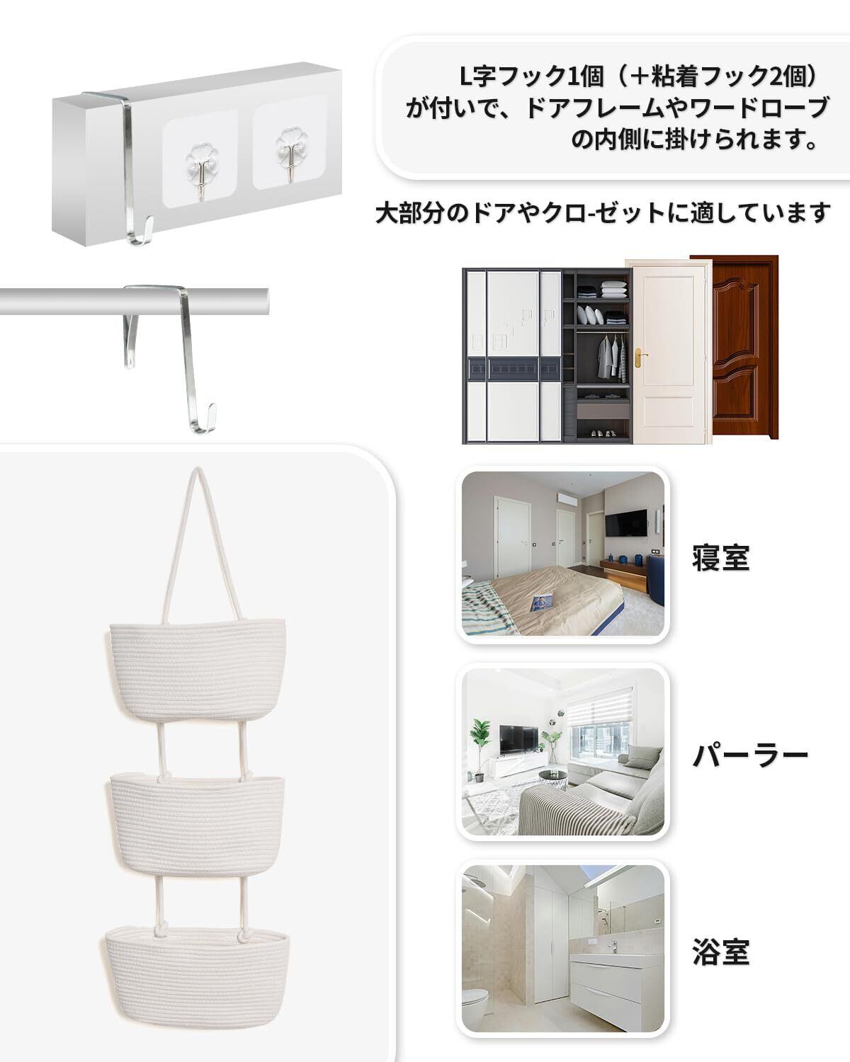 商品用途・使用方法 ドア裏収納, クローゼット収納, 洗面所収納, タオル・おもちゃ・小物収納, スペース節約収納, 壁面整理