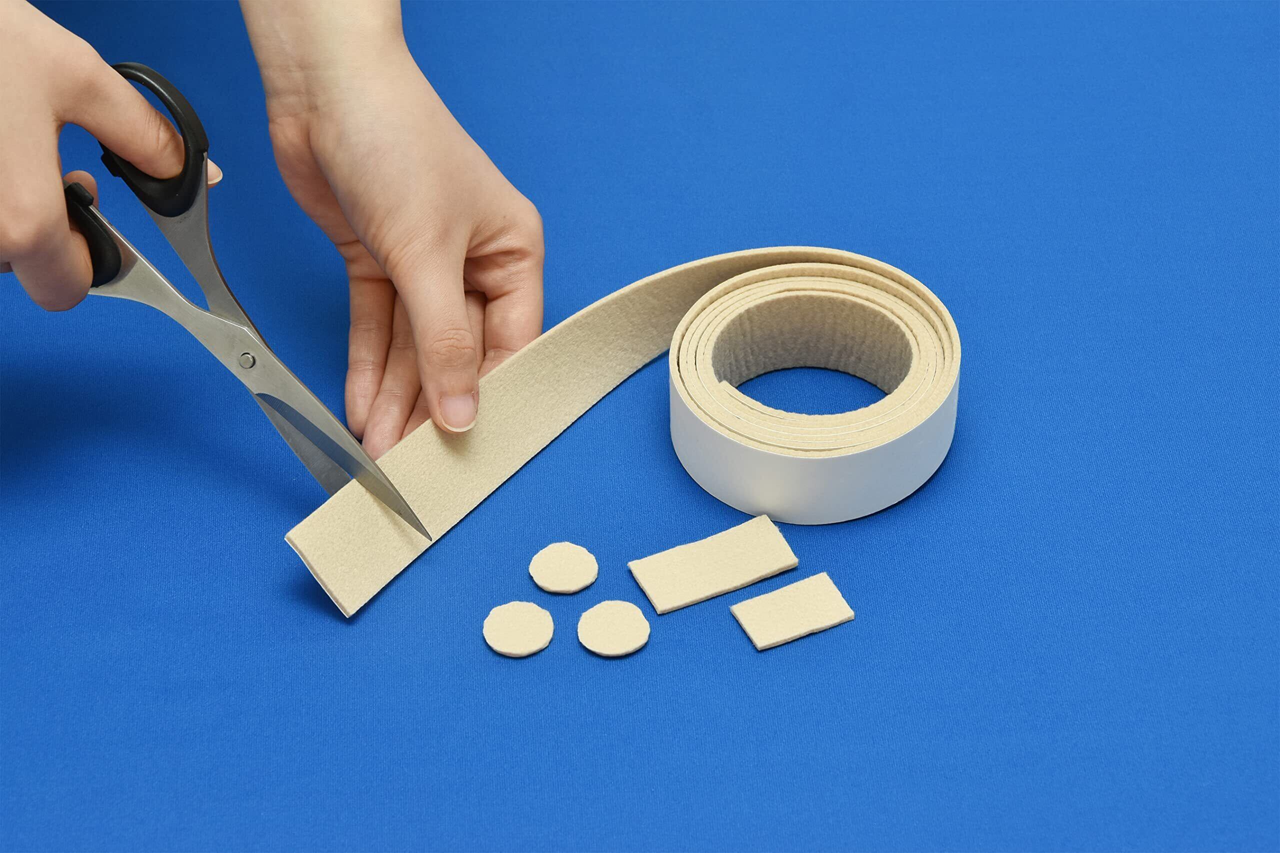 ハサミで自由にカットして使える床のキズ防止テープです。脚裏に貼るので家具のデザインを損ないません。