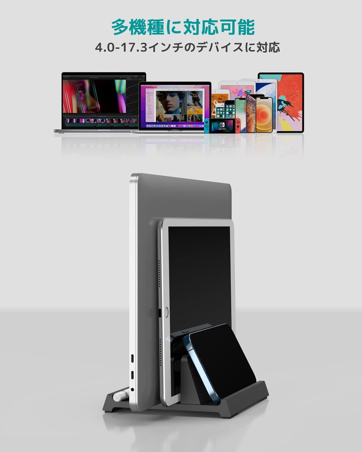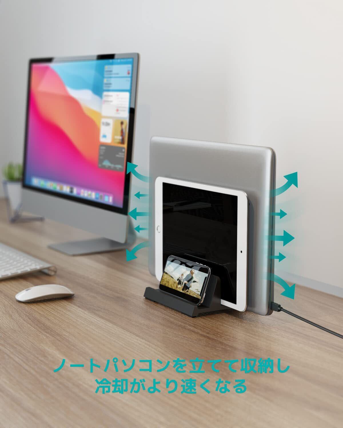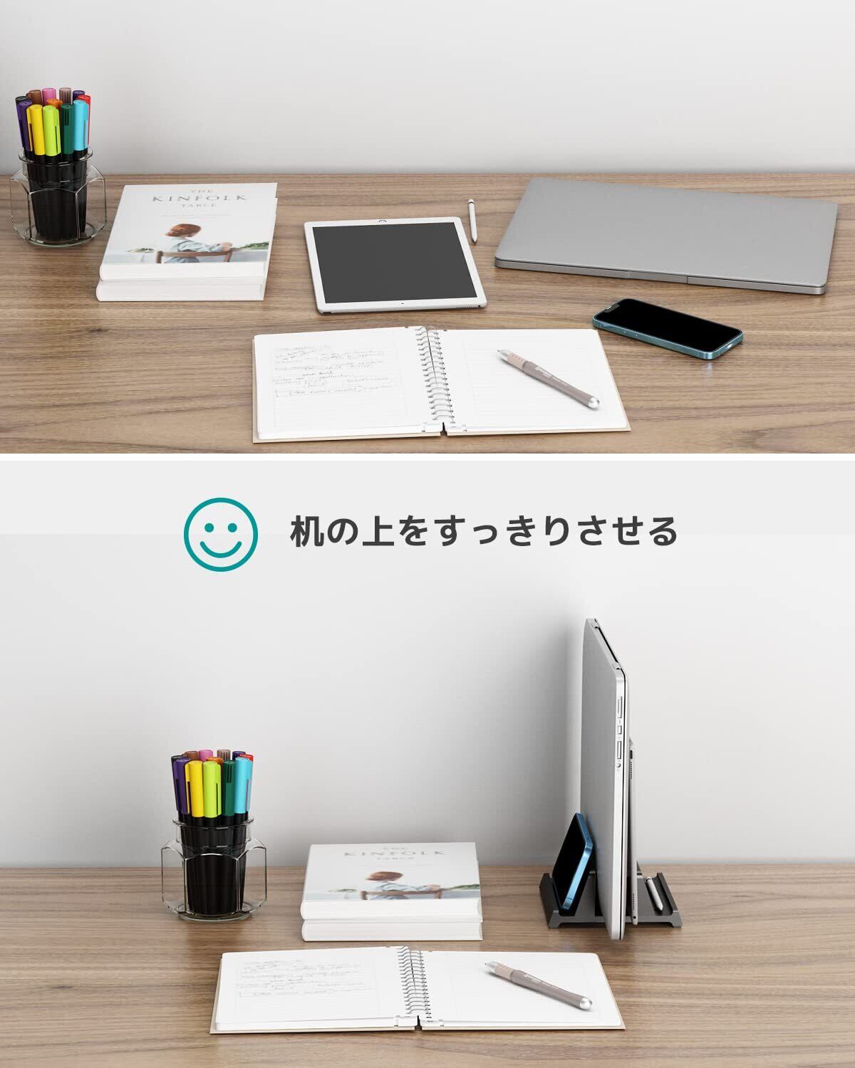 【楽に卓上を整理整頓】デバイスを立てて一箇所に集中して収納すると、様々なものが散らかっている状態から解放され、より多くの卓上スペースを節約し、キーボードや本などを置くためのスペースが作れるようになります。