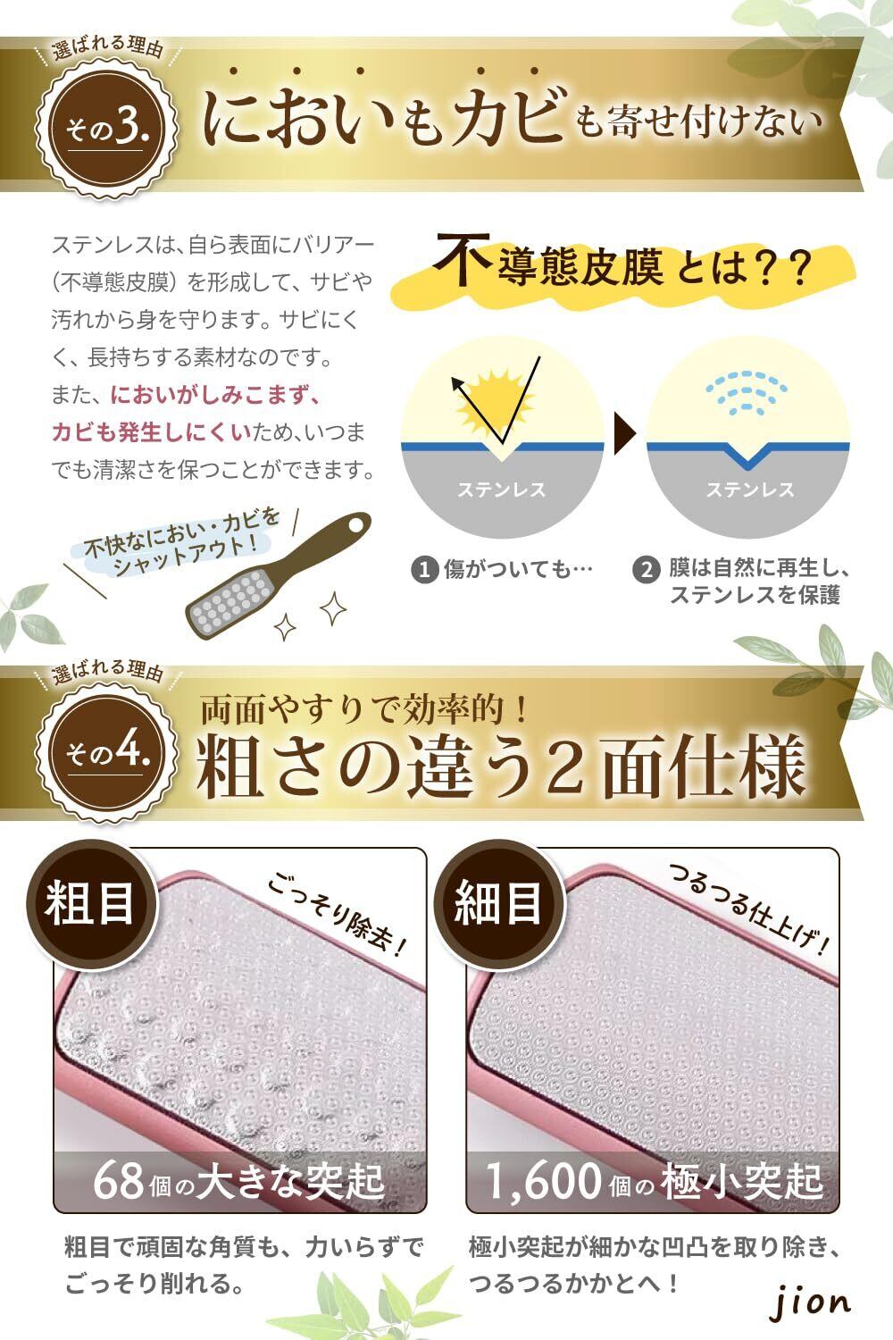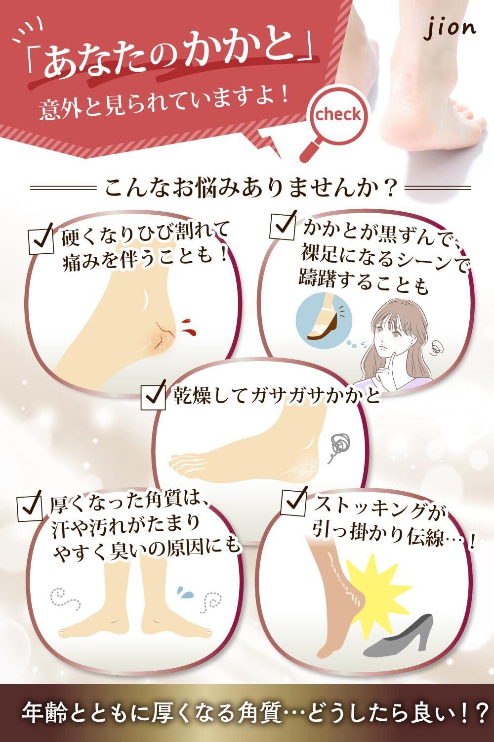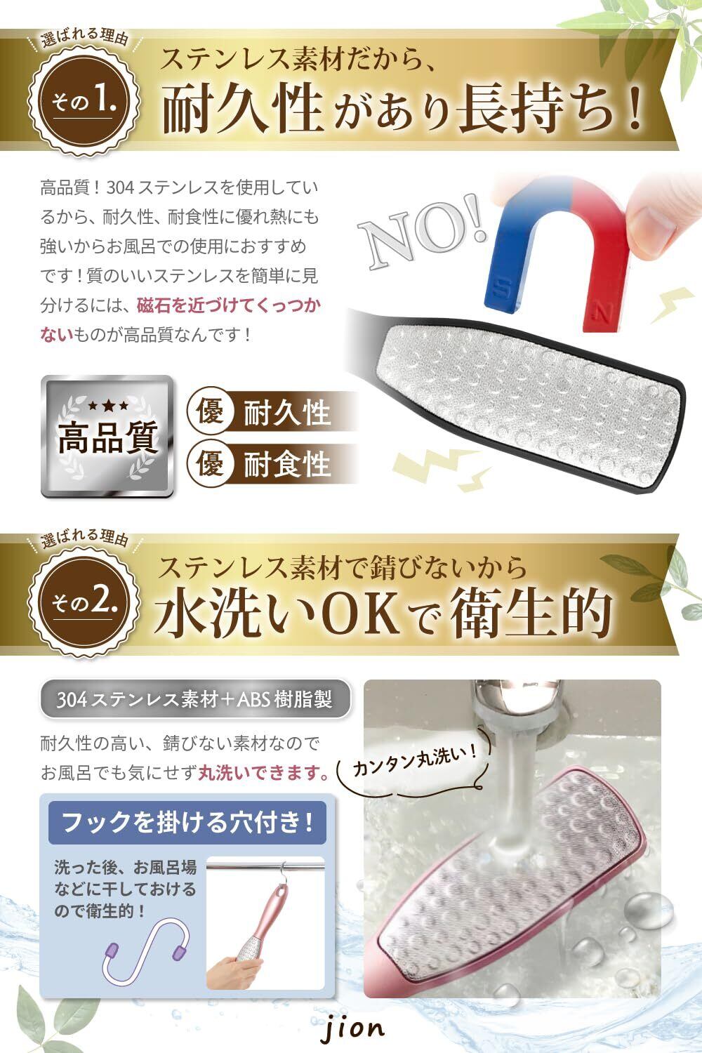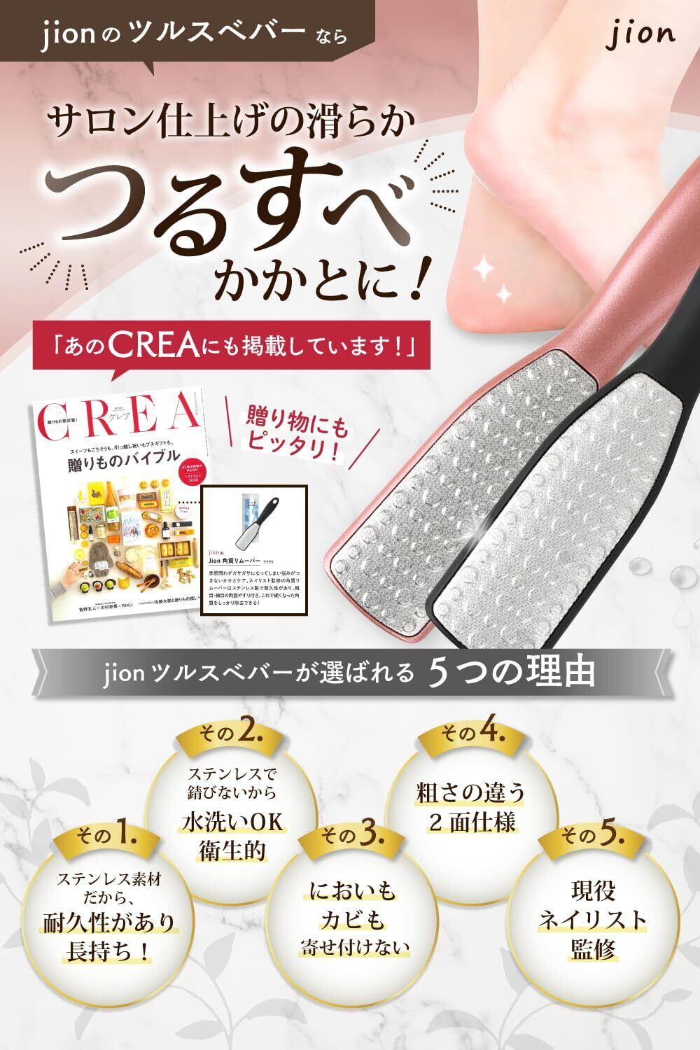 現役ネイリスト監修】のjion角質リムーバー!季節問わず、悩みの多い気になるかかと。夏は素足になるから足裏の角質、魚の目が気になります。冬は硬くなった踵の角質が厚く硬くなり乾燥でかかとがガサガサ。踵がパックリ割れて血がにじんでしまうこともありませんか?ストッキングが伝線、タイツが引きつれちゃうなんてことも・・・そんな足の裏のお悩みを、軽石では実現できなかった簡単にサロン帰りのきれいな踵をめざしてかかとケアできるかかとやすり、ツルスベバーです