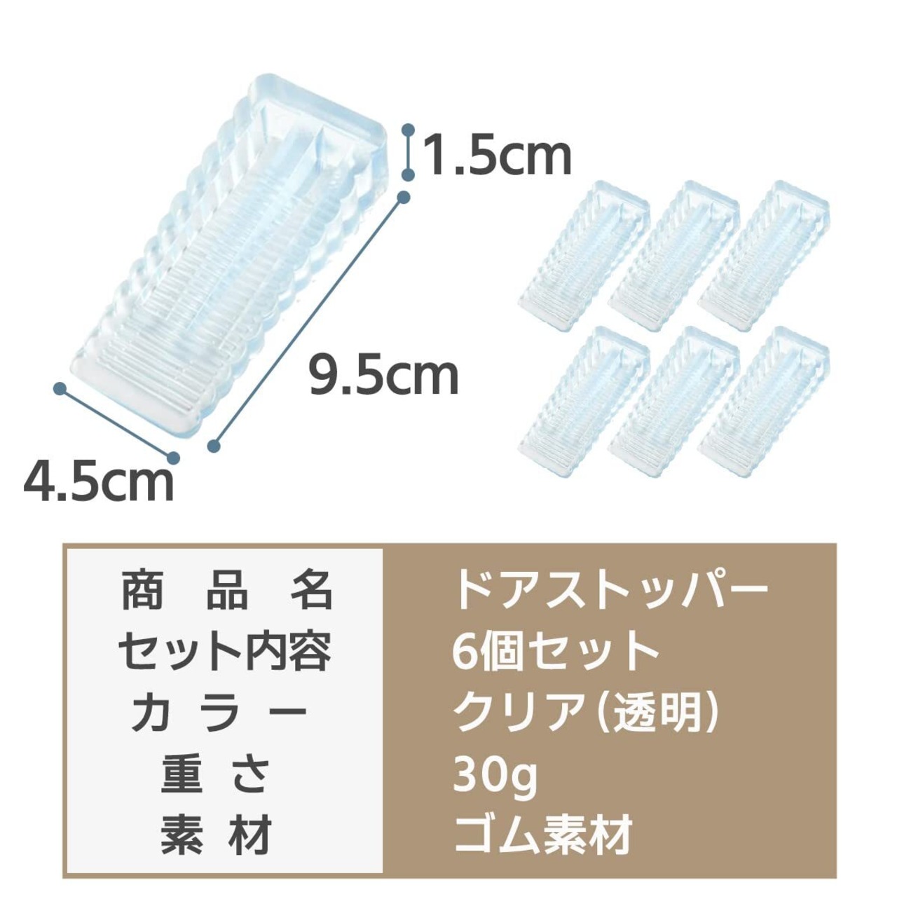 【商品内容】ドアストッパー 【セット内容】6個セット 【カラー】クリア 【サイズ】約9.5×4×1.5cm 【重さ】30g 【素材】ゴム素材 ※モニターの環境により、色の見え方に若干差が生じる場合がございます。
