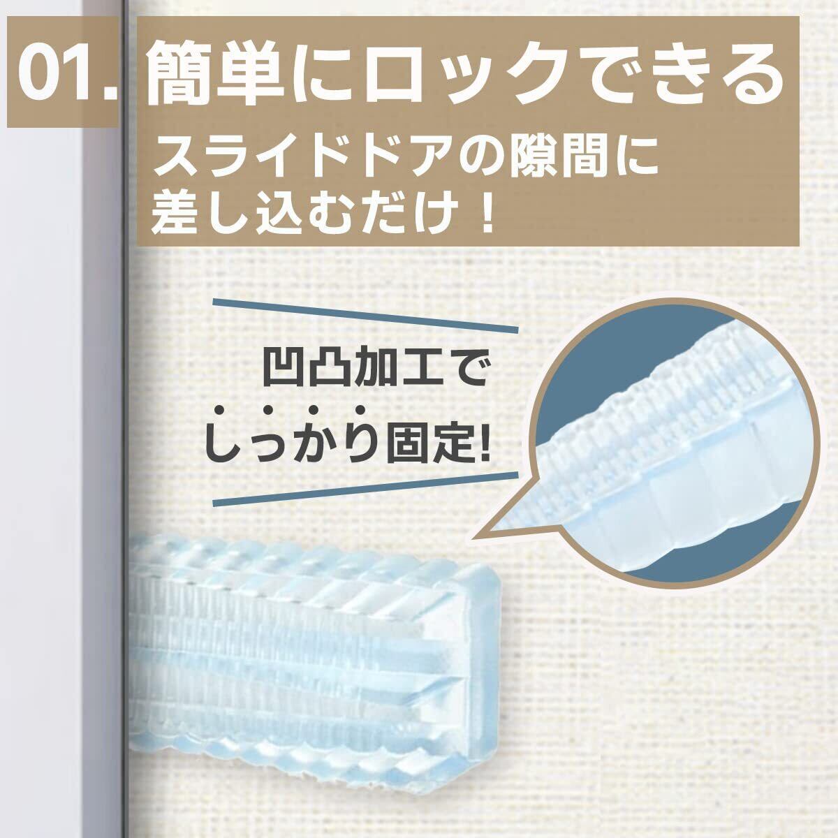 【ペットや赤ちゃんによる引き戸の開閉を防止】愛犬や愛猫の押し入れでのイタズラ防止や、スライドドアによる赤ちゃんの怪我の防止に役立つ、ドアストッパーです。ストッパーをスライドドアのすき間に差し込むだけで簡単にロックができます。表面には凹凸加工がされており、しっかり固定できます。