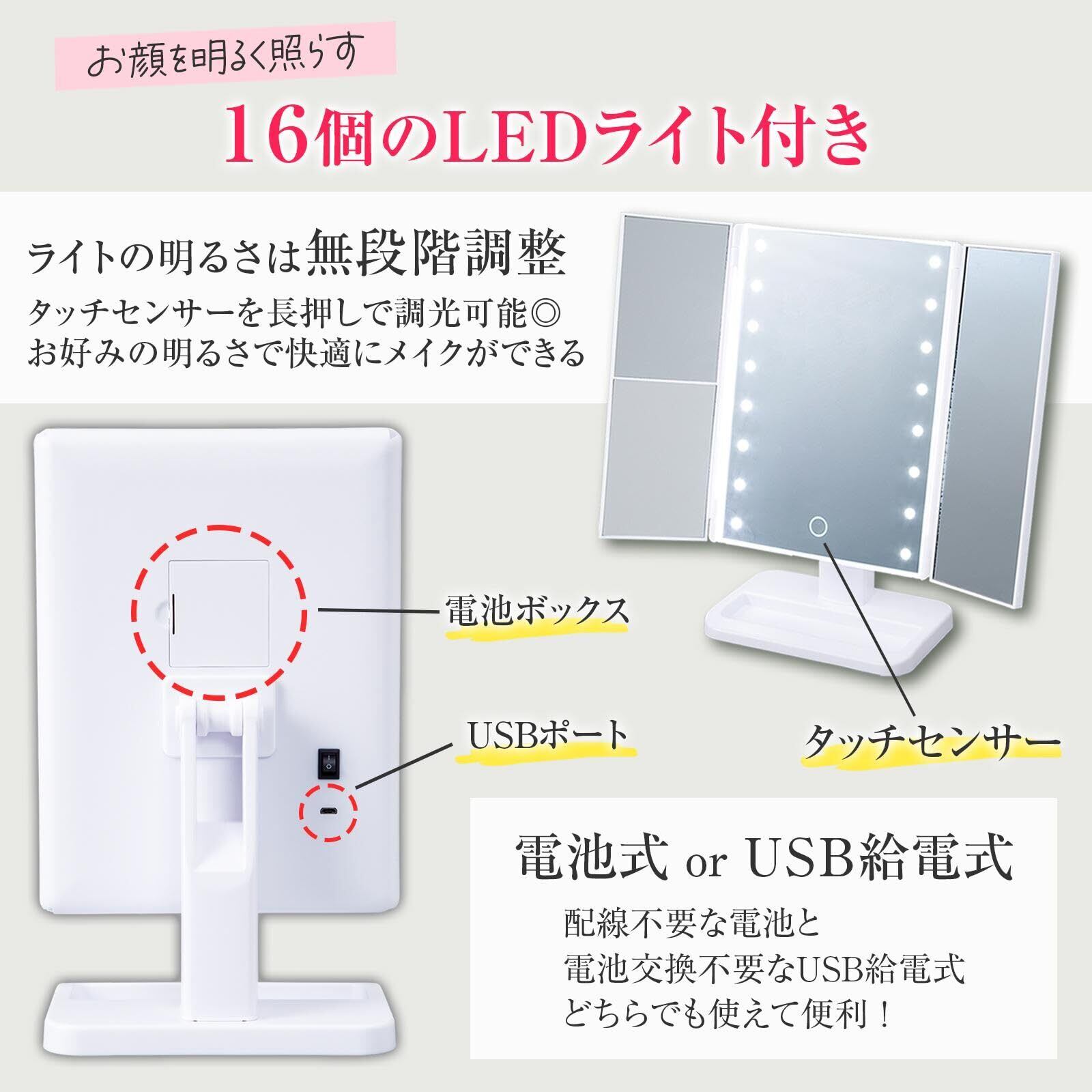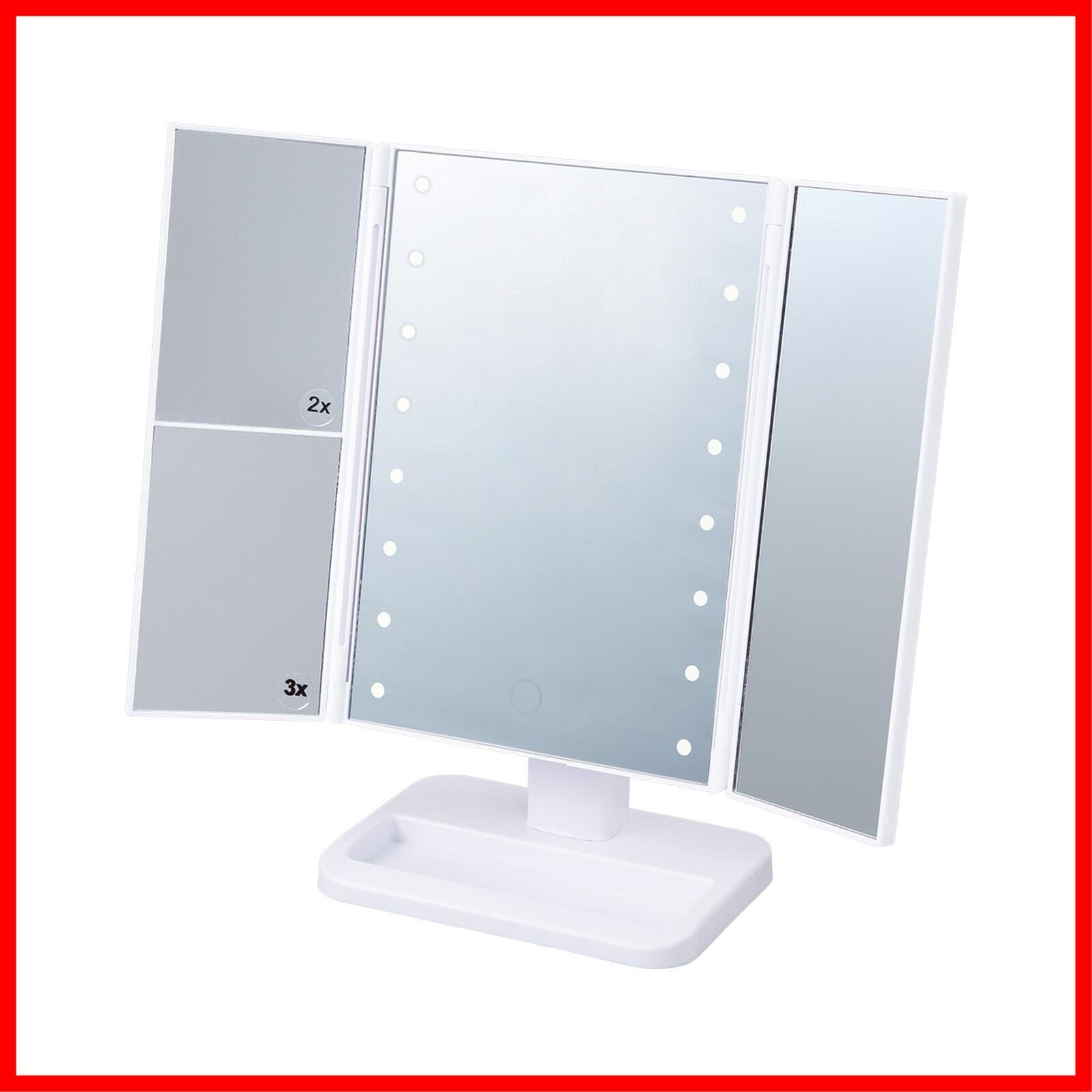 コモライフ 拡大鏡付き LED3面ミラー 鏡 スタンド 女優ミラー 2倍 3倍 拡大鏡 三面鏡 卓上 ライト ワイド