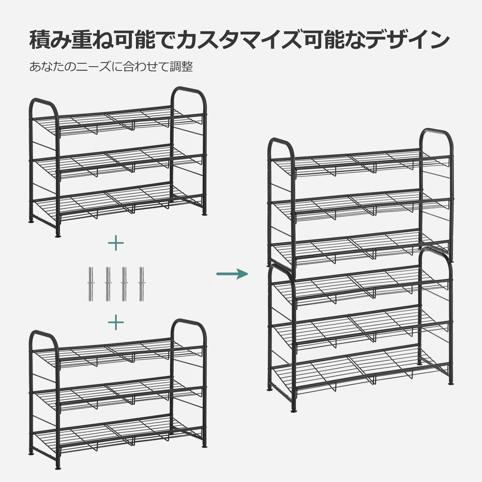 【積み重ね可能な3段シューズラック】2セット以上を垂直に積み重ねることで、クローゼット、玄関、角に最適な12段のシューズラックを完成させ、小さなスペースを最大限に活用できます。さらに、水平に並べることでユニットを拡張し、DIYのパーソナライズされた収納を実現することも可能です。