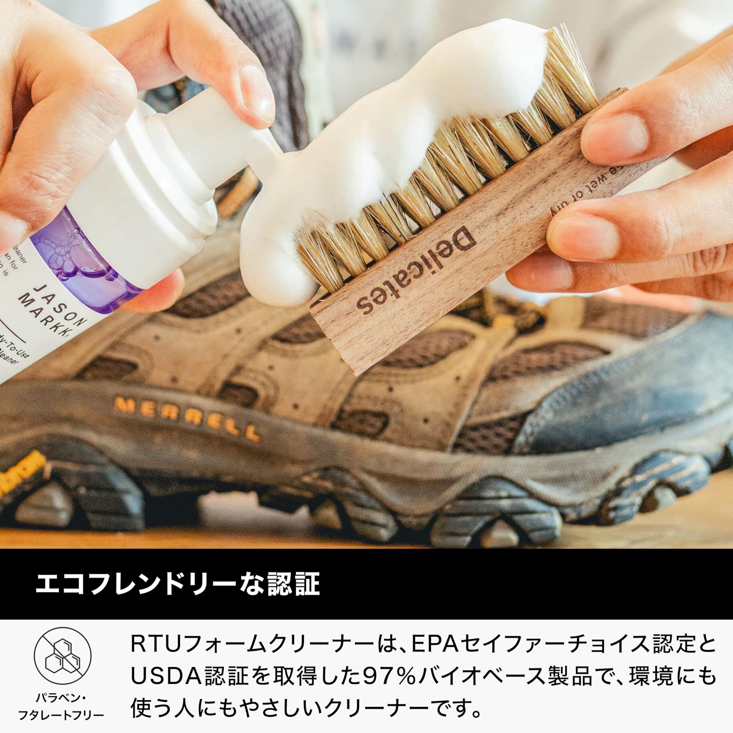【環境に優しい成分】RTUフォームクリーナーは、EPA セーファーチョイス認定、USDA認定 97% バイオベース製品で、あなたと環境に優しいクリーナーです。また、デリケートクリーニングブラシは、柔らかい豚毛を採用し、レザー、スウェード、ヌバック、コットン、ニットなどのデリケートな素材のクリーニングに最適です。