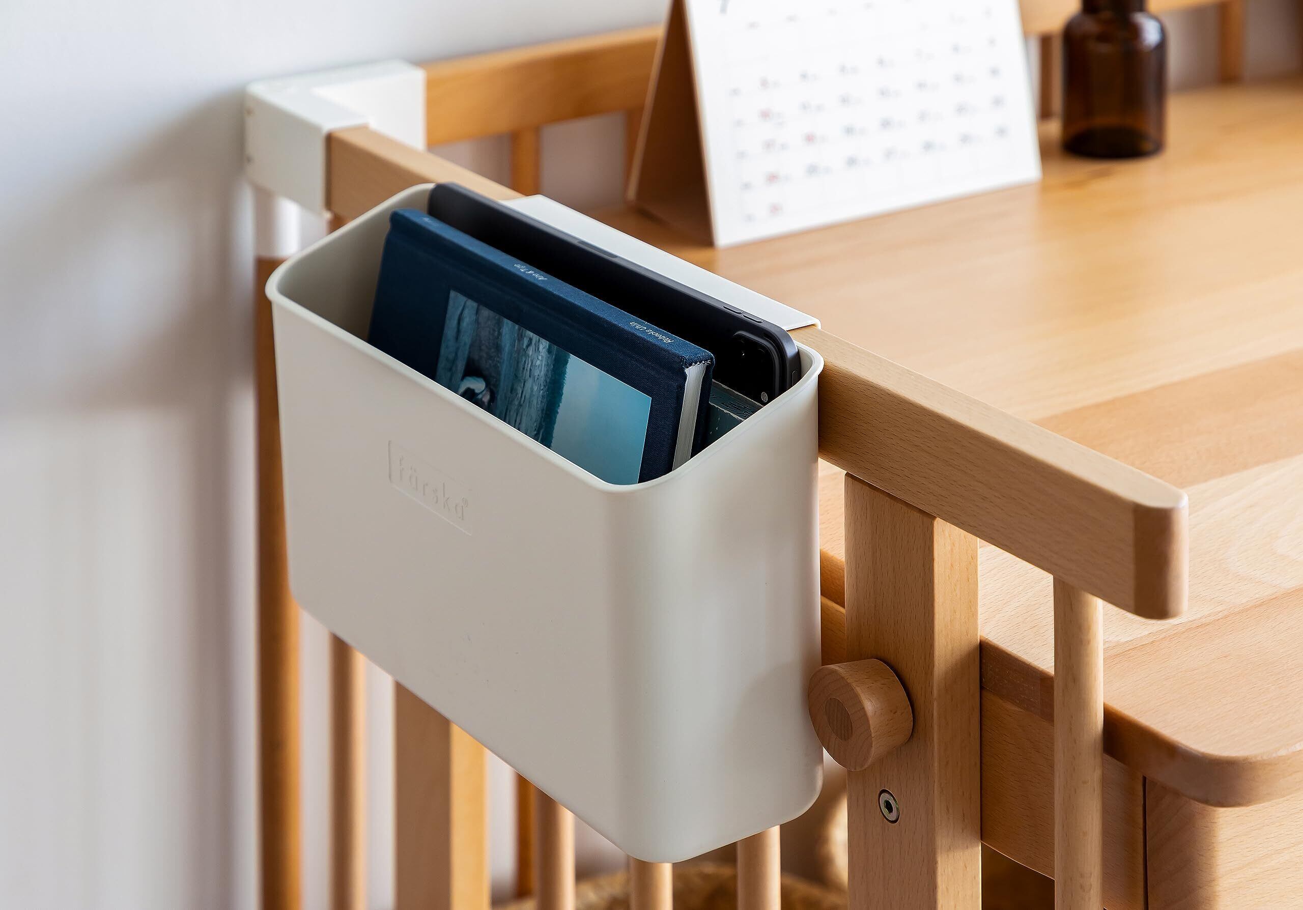 "ファルスカのベッド/チェア用のアクセサリーです。 対応製品のフレームにボックスを引っ掛けるだけで、育児で必要な小物を収納できます。 新生児期にはオムツやガラガラ、離乳食にはおやつや飲み物、大きくなれば絵本や筆記用具などをサッと取り出せてとても便利です。"
