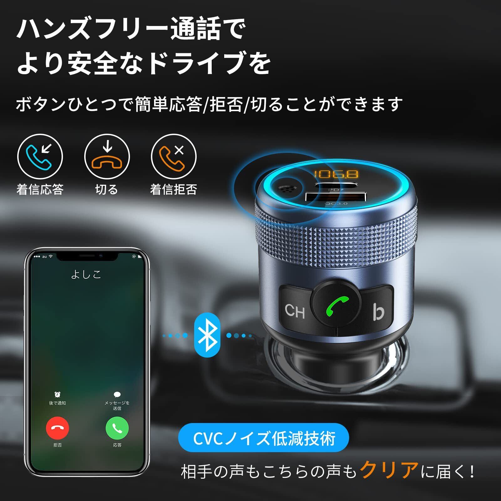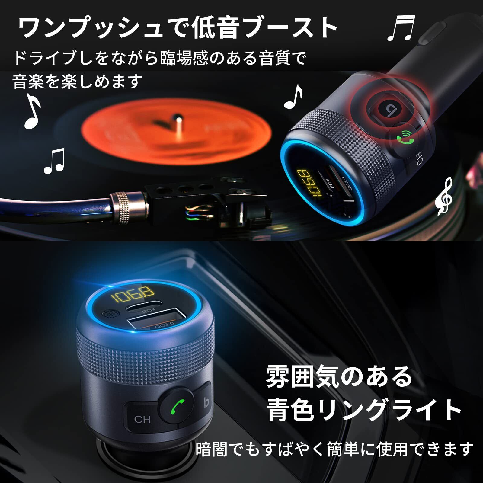 【Bluetooth5.1新登場】 FMトランスミッター HUNDRUP QC3.0急速充電 PD20W対応 USB *1口/Type-C *1口 車載 重低音モード Siri&Google Assistant対応 LEDライト ハンズフリー通話 12~24V車対応 電圧測定 周波数76-108Mhz 日本語取扱説明書 | hananoki