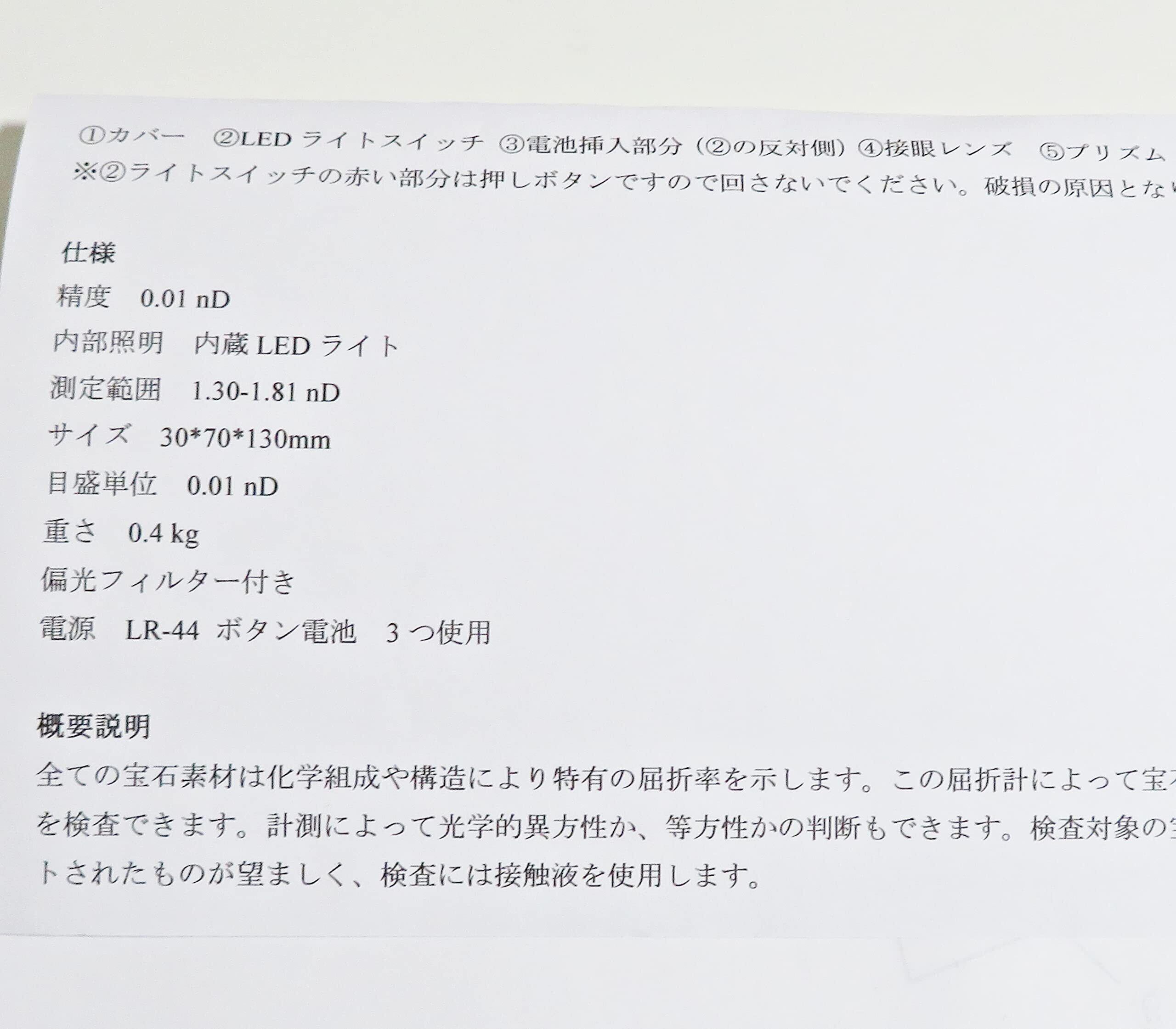 宝石の鑑別に必要な屈折率を測定する機械です。 最大でRI1.81まで計測できるタイプです。 持ち運びやすい大きさです。 英語・日本語説明書つき。(屈折率を記載した特性値表は付属しません。) LR-44 ボタン電池3つで内蔵のLEDライトが作動し、独立して計測が可能です。(電池別売り)