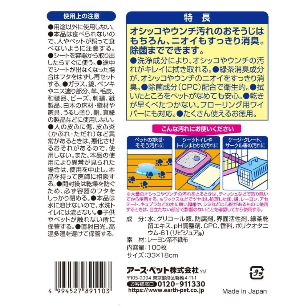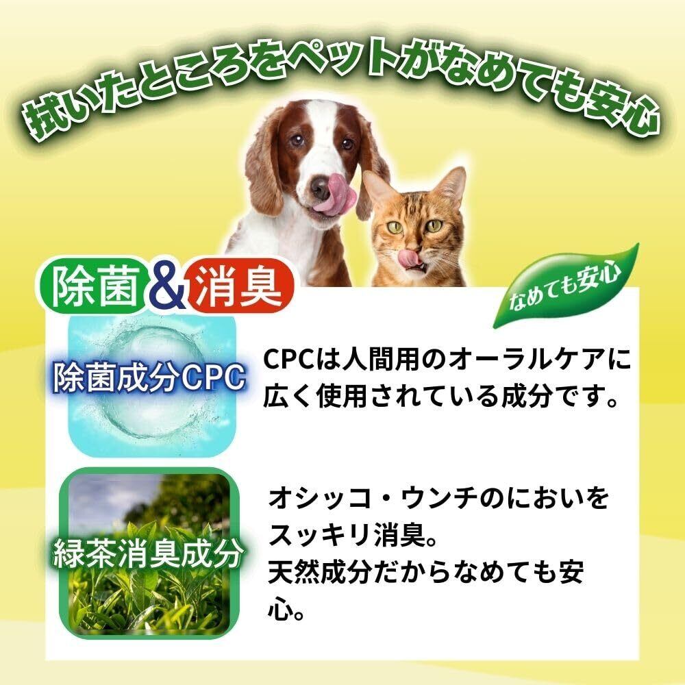 ● オシッコやウンチ汚れのおそうじはもちろん、ニオイもすっきり消臭。除菌までできます。 ● 洗浄成分により、オシッコやウンチの汚れがキレイに拭き取れる。 ● 緑茶消臭成分が、オシッコやウンチのニオイをすっきり消臭。 ● 除菌成分(CPC)配合で衛生的。 ● 拭いたところをペットがなめても安心。 ● 乾きが早くべたつかない。フローリング用ワイパーにも対応。 ● たくさん使えるお徳用。 ● ペットの排泄・そそう汚れに。シーツトイレやトイレまわりの汚れに。ケージ・クレート、サークル等の汚れに。