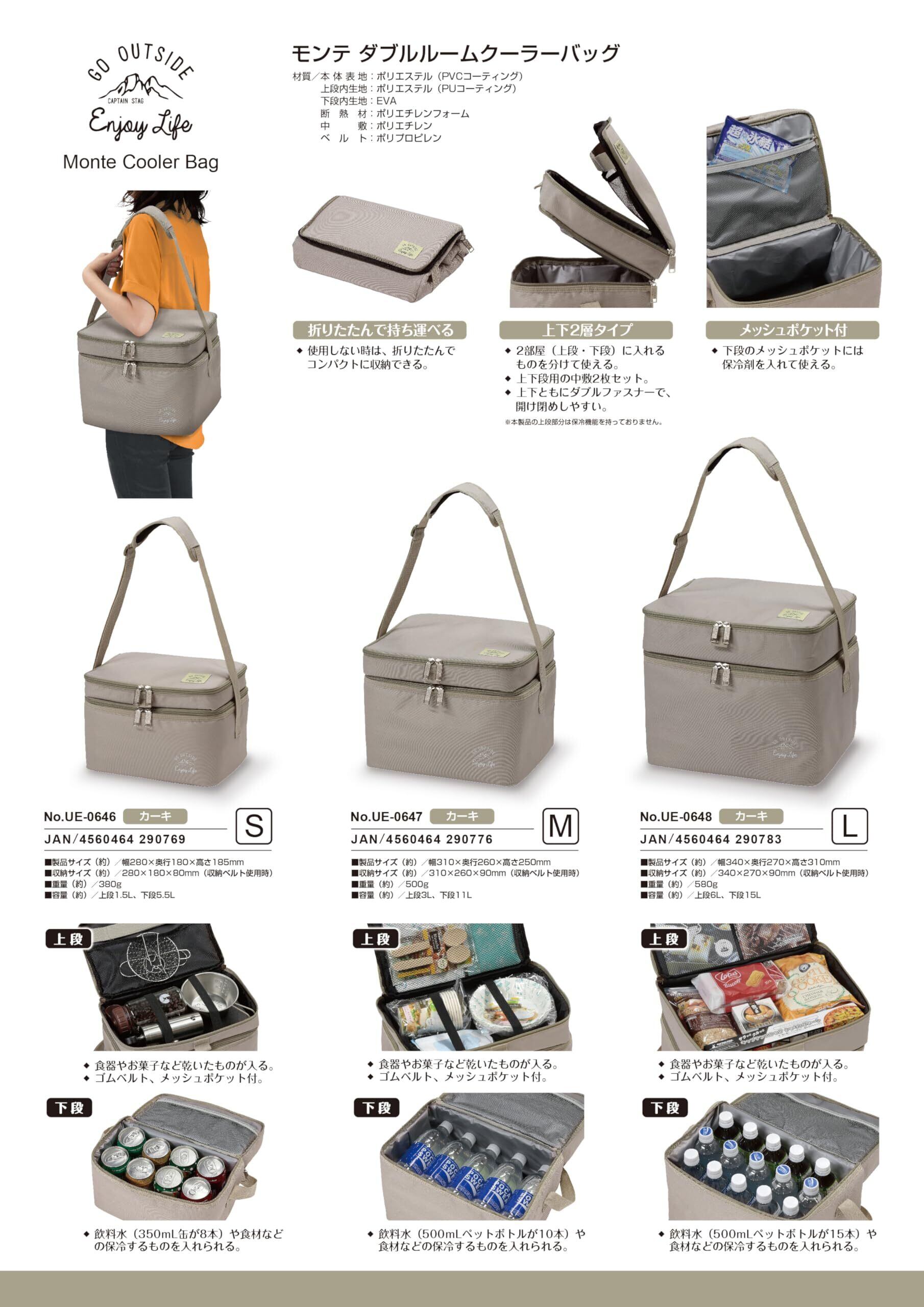 キャプテンスタッグ(CAPTAIN STAG) 保冷バッグ クーラーバッグ 折り畳み収納可能 ダブルルームクーラーバッグ S/M/Lサイズ カーキ モンテ UE-646/UE-647/UE-648 | hananoki