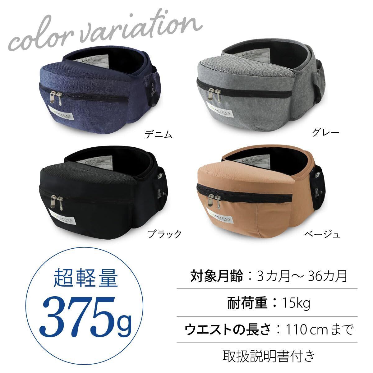 【赤ちゃんと一緒にもっといろんなところへ出掛けたい!】電車やバスなどの移動時や、荷物が増えるお買い物、お散歩はもちろん、イベントや旅行など、さまざまなシーンでお使い頂けます。アクティブなお出かけはもちろん、赤ちゃんがおねむモードの時も◎!赤ちゃんと密着できるので、お母さんのぬくもりを感じながら、安心して眠れます「抱っこ!」「降ろして!」のわんぱく赤ちゃんにもオススメです! 【対象年齢】3カ月~ 【推奨耐荷重】20kg【サイズについて】ウエスト60cm~110cm対応可能 *帝王切開でご出産されたお客様へ:ヒップシートは構造上、下腹部に一定の力がかかる仕様になっております。お子さまの重みで下腹部の痛みが生じる場合がございますのでご注意ください。