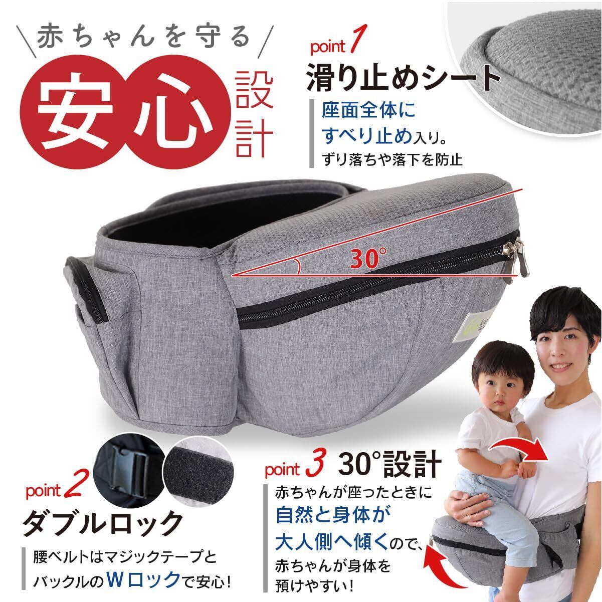 【ママ&パパと赤ちゃんに優しい安心&快適構造】《その①シート全面に滑り止め》赤ちゃんが座るシート部には全面に滑り止めが縫い付けられているので、赤ちゃんが動いても滑らず安心です。《その②2重で固定する腰ベルト》腰ベルトはマジックテープでベルトを固定した後にバックルを留め、固定します。2重でしっかり固定されるので安心です。《その③赤ちゃんが快適に過ごせる30°設計のシート》シート部は赤ちゃんの身体に負担がかからない30°設計になっています。また、斜めに傾いていることで、赤ちゃんが体を傾けても倒れにくいので安心です。