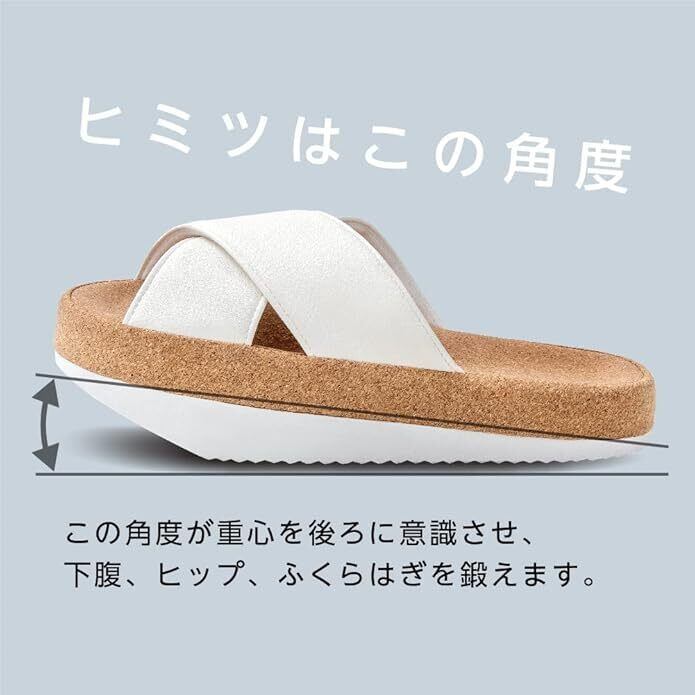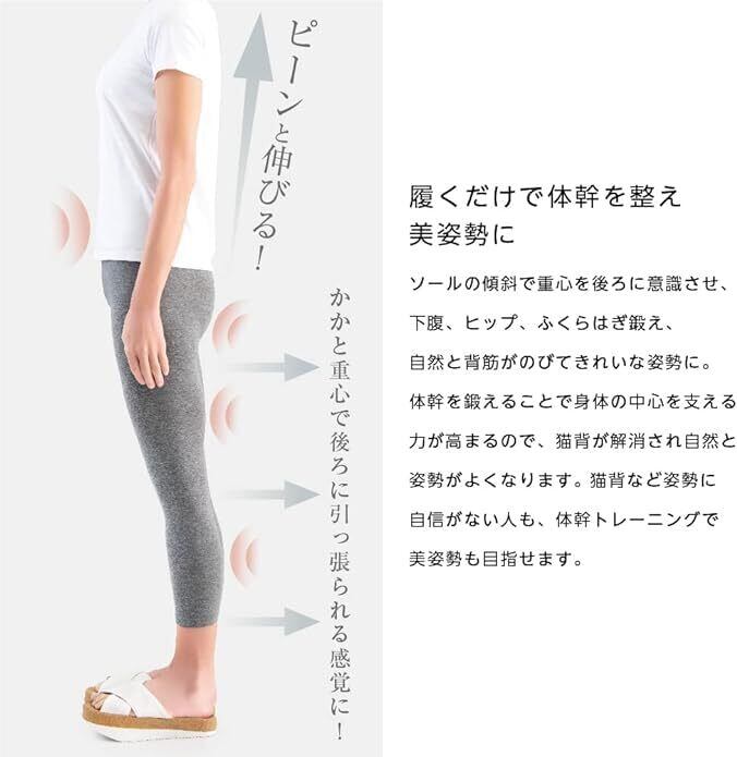 【履くだけトレーニング】ソールの傾斜が、体の重心を後ろに意識させることで、下腹、ヒップ、ふくらはぎにキュッと力が入り正しい姿勢に導きます。