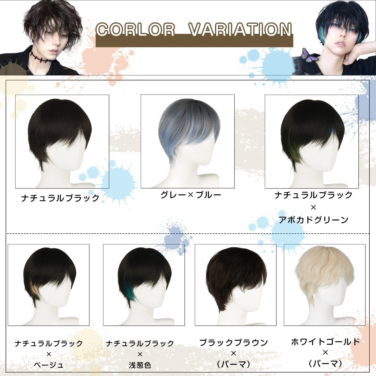 ストレート×インナー:落ち着いた黒髪ベースの髪に、明るいベージュ、アボカドグリーン、浅葱色のインナーカラーをプラス。 髪色の赤みを消してくれるカラーなので、色落ち後も洒落感キープ! メンズウィッグとも相性抜群。