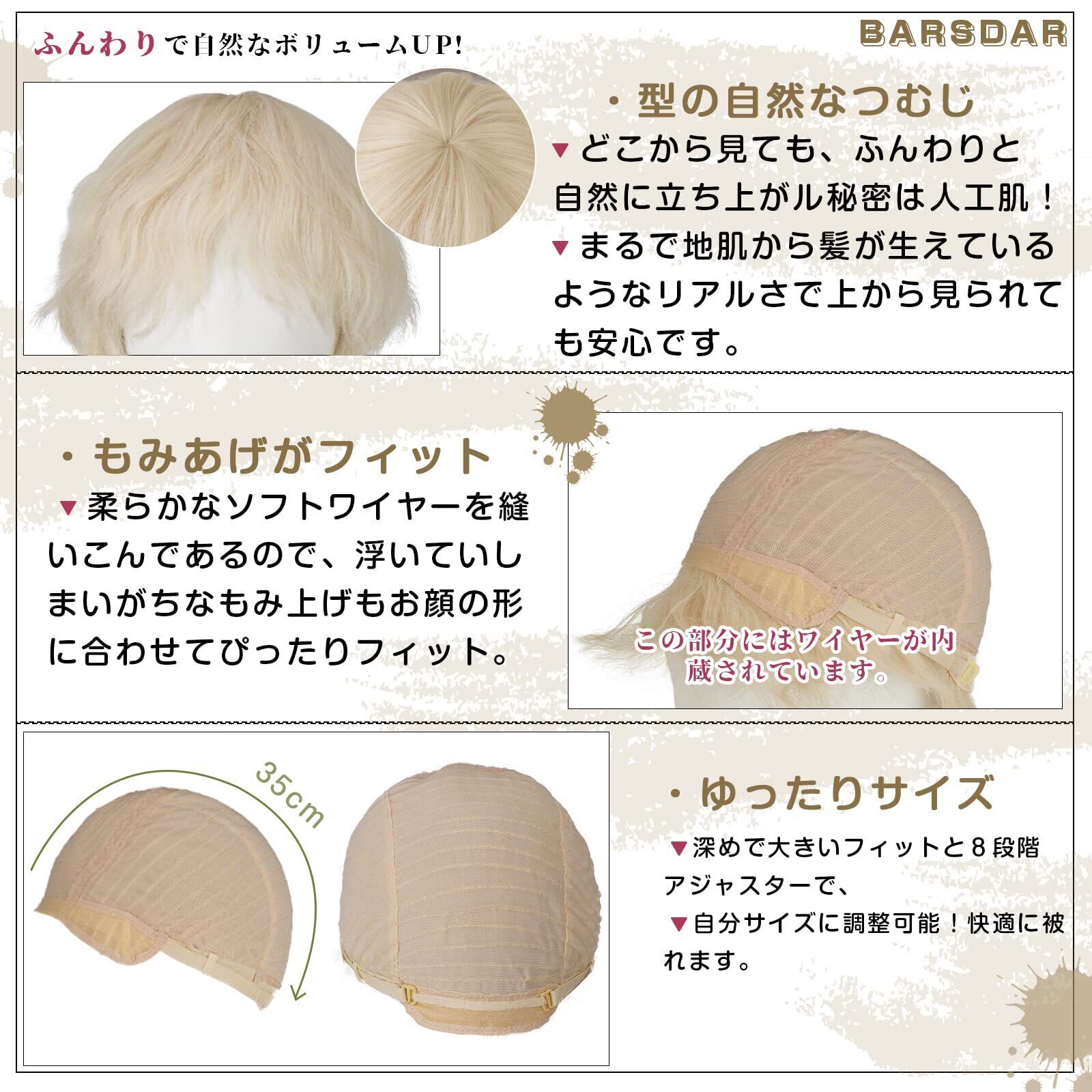 前髪:約19cm 後髪:つむじから約33cm フリーサイズ (頭周り:52cm-58cm サイズを調節できるアジャスター付き)