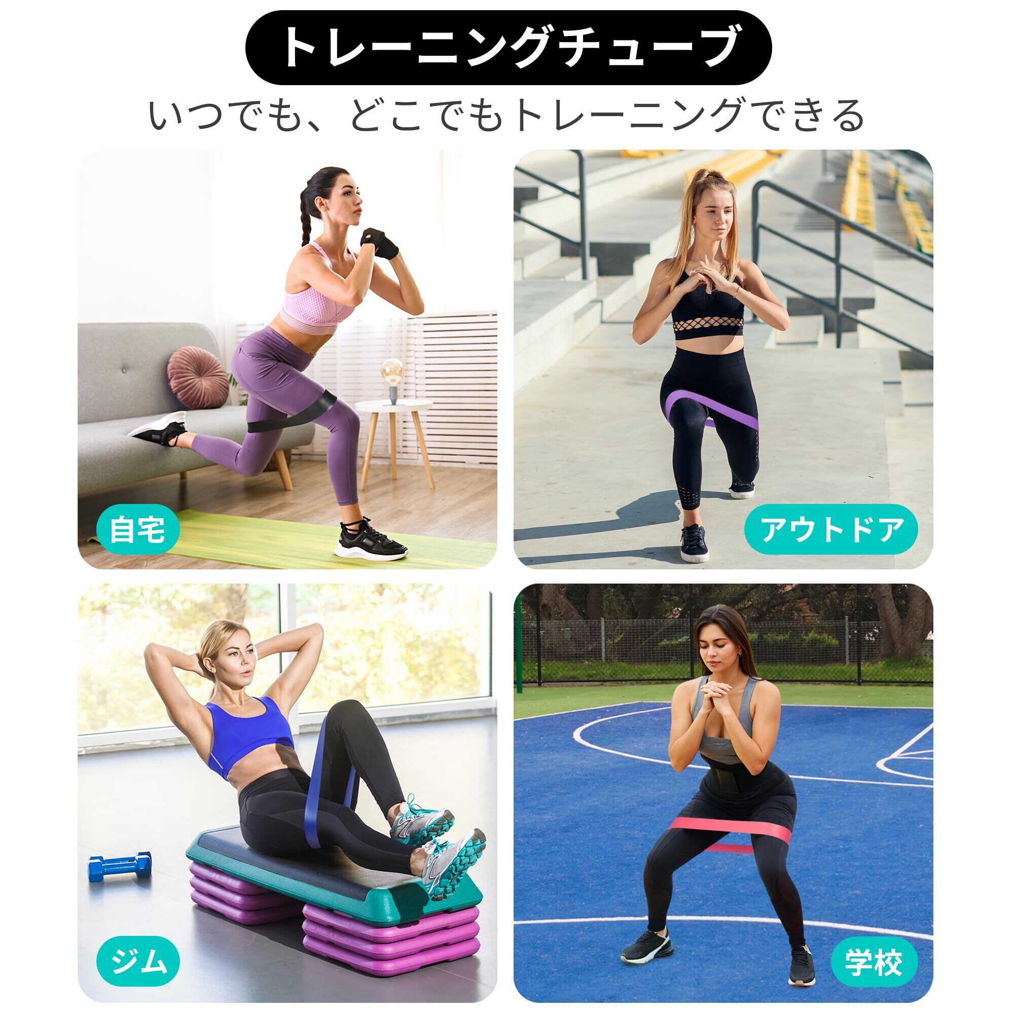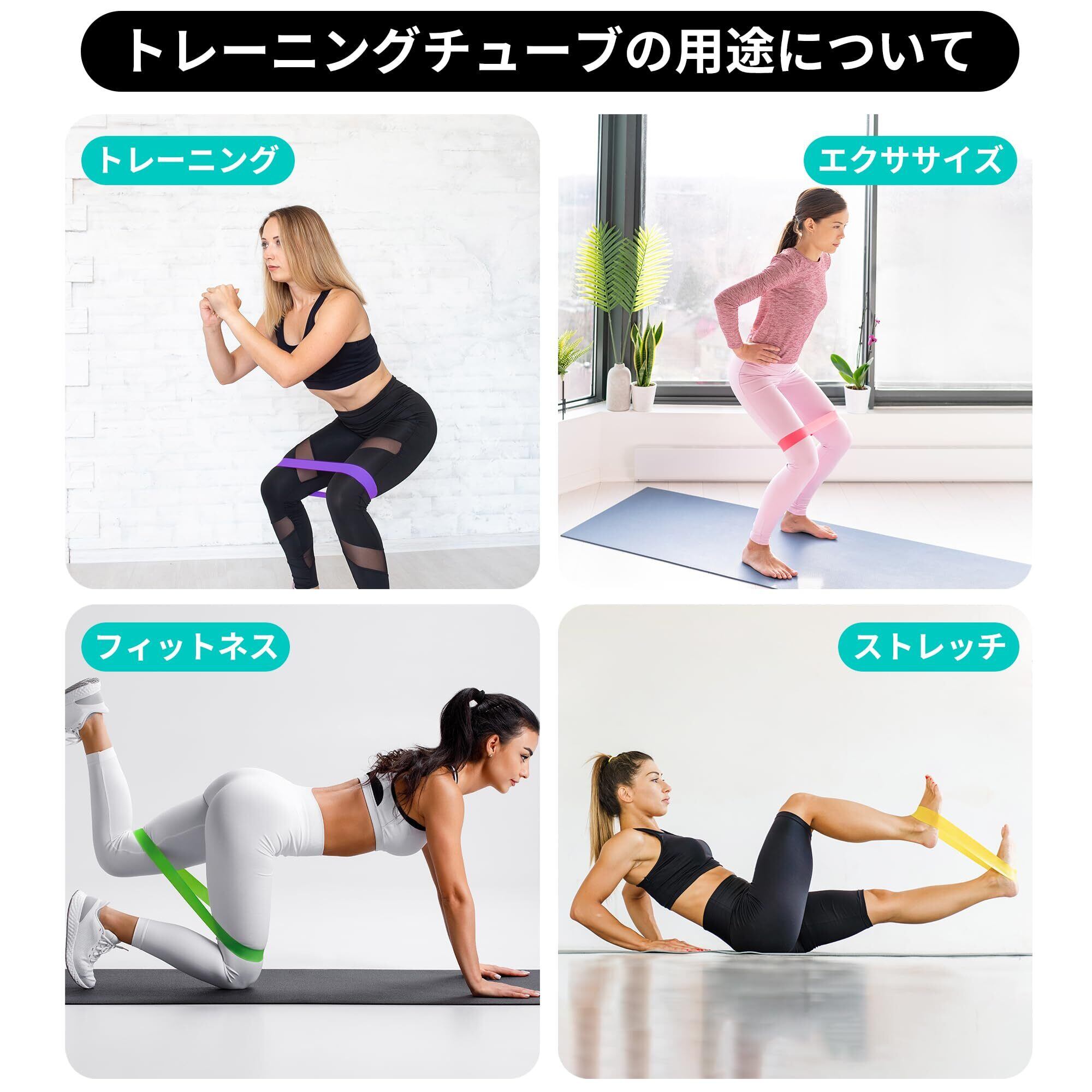 【5から59kgまで負荷が変えられます】5種類の負荷のトレーニングバンドがあり、組み合わせて自分にあった負荷を調節できます。幅が広く負荷をかけた時の安定感が抜群です。ゴムバンドは自在に伸縮できますので、筋トレ、体幹トレ、ストレッチ、美尻など幅広く活用できます。ちなみに、普段鍛えられなかった内転筋はスクワットでトレーニングできます。