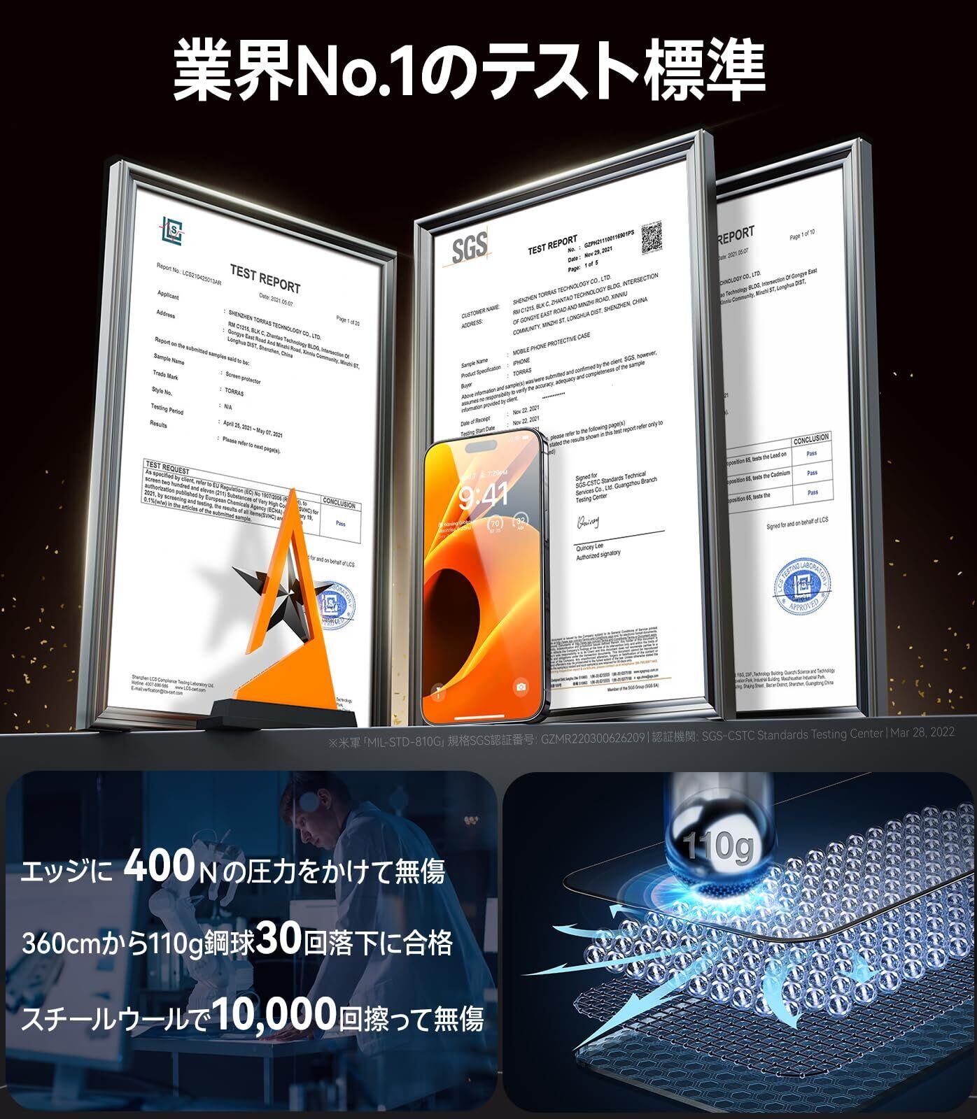 【米規格越え・より大きなSuperディスプレイのために設計】 Na+/K+イオン交換強化、焼き戻し超二重硬化、SCL緩衝層などの30を超える革新的な技術により、アイフォン15プロマックス 専用 フィルムの表面に圧縮応力層を生成し、伝わる衝撃力(250+Nを吸収可能、2m落下無傷)を瞬時に分散させ、画面割れを徹底的に防ぐ、本当に画面保護と絶対的なあんしん感を与える。更に、曲線に従って全画面を覆うことで、エッジに極限まで磨いたラウンド加工技術を採用し、引っ掛かりもなく、ぴったりで装着感なく、どんな角度から落ちてもフチ割れの心配はご無用。その上で、ケースとの相性も抜群で、浮き上がらず、縁に埃も寄せ付なし、いつも清潔で、綺麗に!※米軍「MIL-STD-810G」規格認証番号:GZMR220300626209|認証機関:CSTC Standards Testing Center|Mar 28, 2024
