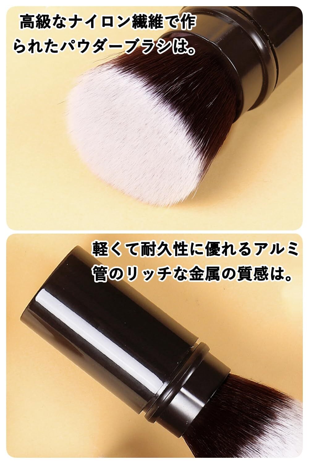 【材質】高級なナイロン繊維で作られたパウダーブラシは、軽くて耐久性に優れるアルミ管のリッチな金属の質感は。