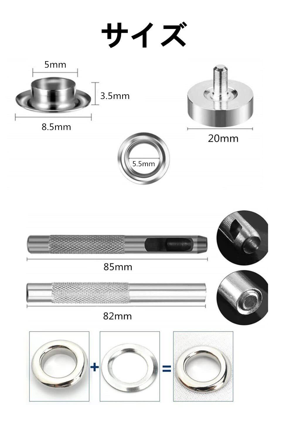 【パッケージ内容】両面ハトメキット *400組、 打ち棒*2、 打ち台*1、 収納ケース*1 。4色:ゴールド、シルバー、古銅色、ガンメタル。サイ ズ :5mm。豊富なアクセサリーがありますから、いろいろな綺麗なレザー工芸品ができます。