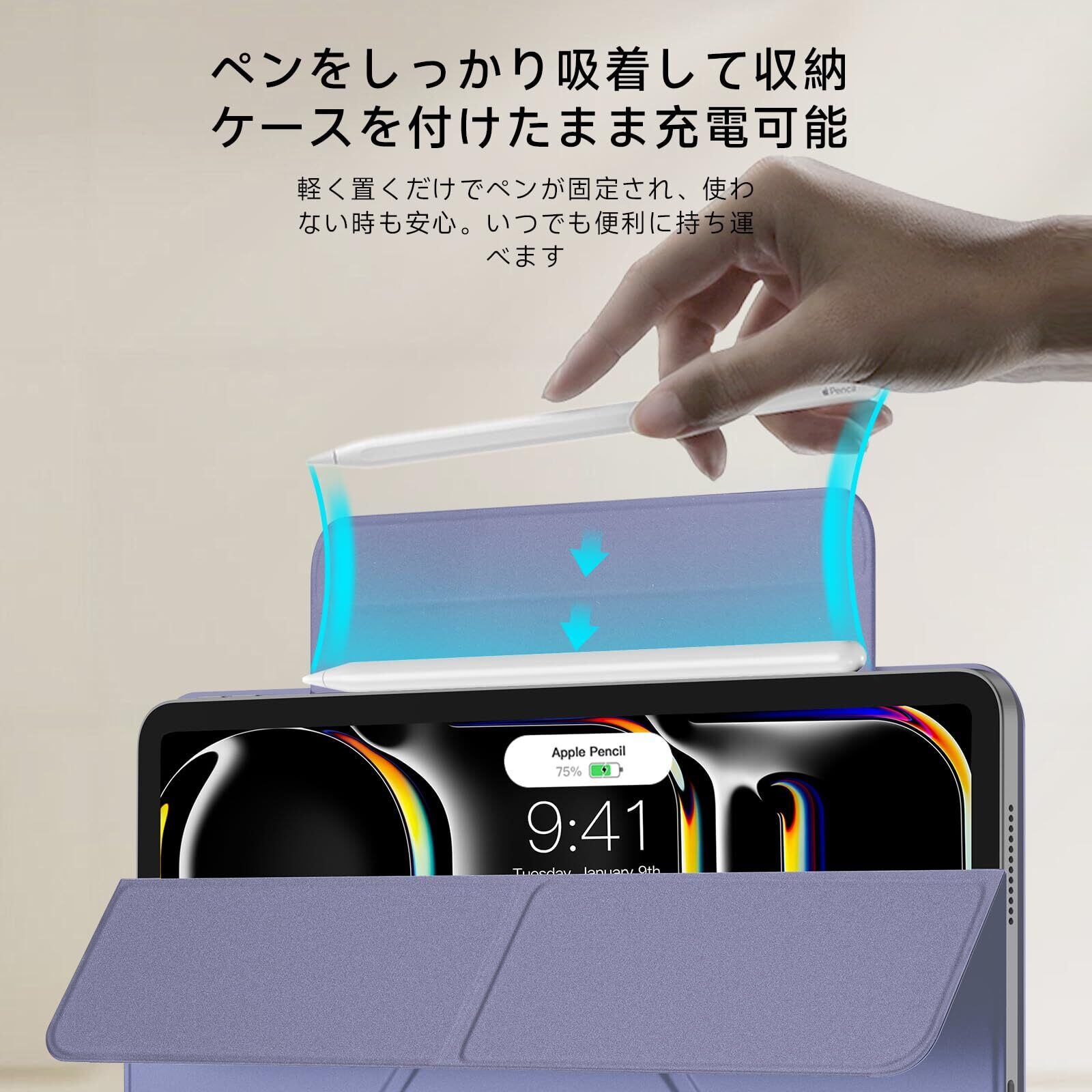 【内蔵式のApple Pencil用ストラップ】隠れたマグネット式ペンシルストラップが、充電中のペンシルをしっかり保持し、外出先での落下を防ぎます。使用しない時はストラップを折りたたんで背面パネルに隠し、ipad pro ケースのミニマルでスマートな外観を保つことができます。