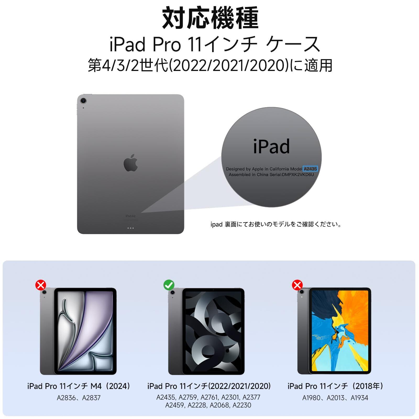 【適用機種】:iPad Pro 11インチ(2022, 第4世代)、iPad Pro 11インチ (2021, 第3世代)、および iPad Pro 11インチ (2020, 第2世代)に対応。モデル番号:A2435, A2759, A2761, A2301, A2377, A2459, A2228, A2068, A2230。他のiPadモデルと互換性がありません、ご購入前、お持ちのiPadのモデル番号をご確認いただきます。