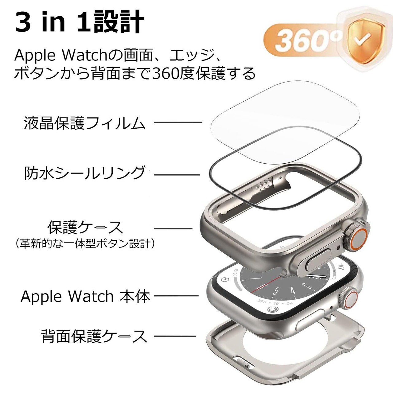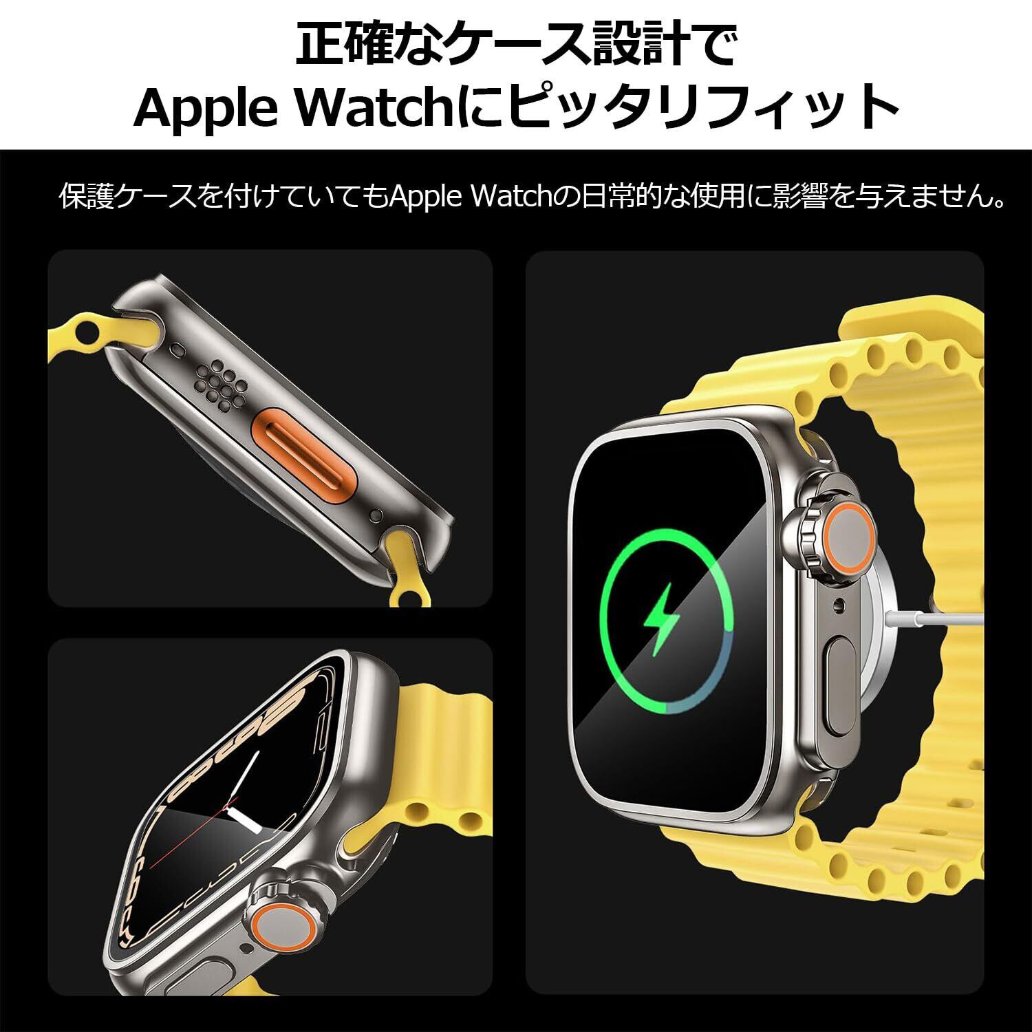 「液晶保護フィルム+保護ケース+背面保護ケースの3 in 1設計」本製品は、Apple Watchの画面、エッジ、ボタンから背面まで360度保護する、Apple Watchケース/フィルム一体型の保護ケース+背面保護ケースの3つの合体設計です。9H硬度の強化ガラスフィルムは、キズに強く耐久性があり、高解像度で高透過率、タッチもスムーズです。PC素材の保護ケースは、落下やキズなどからあなたのApple Watchを保護し、新品の状態を長持ちさせます。