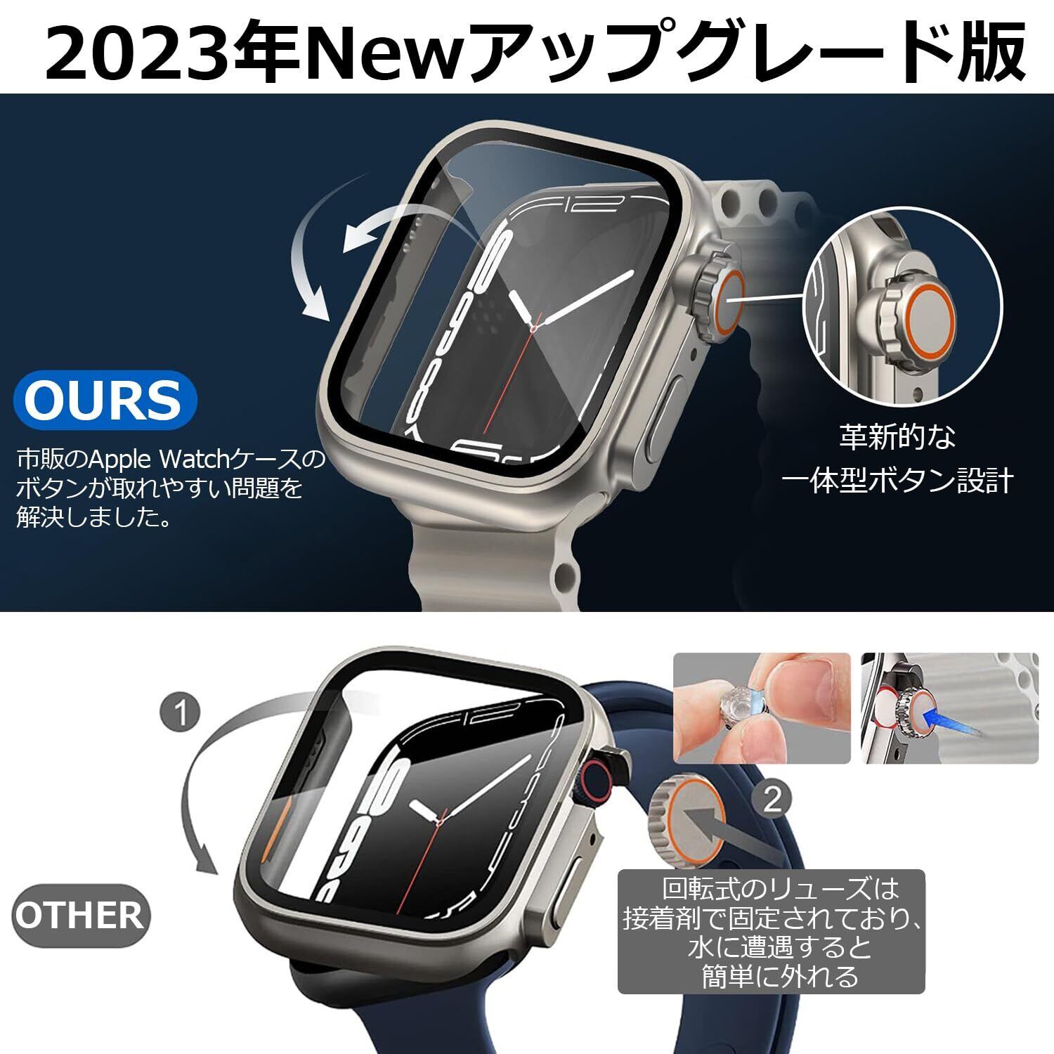 「一体型防水設計!」2023年Newアップグレード版。革新的な一体型ボタン設計で、市販のApple Watchケースのボタンが取れやすい問題を解決しました。IP6の深度防水で、Apple Watchを付けたままランニング、登山、キャンプなど、爽やかな汗をかきながら趣味度を思いっきり楽しむことができます。