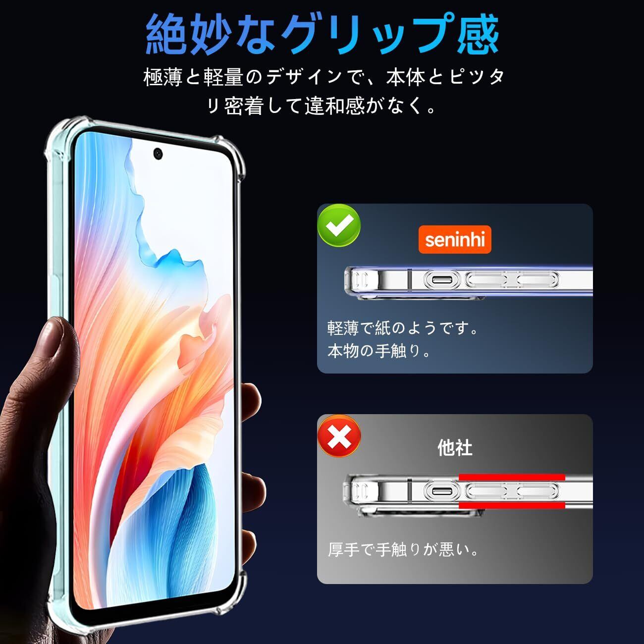 【優れた精度】OPPO A79 5G ケース 薄くて頑丈で、程よいグリップ感があり、できるだけスマートフォン本体のスリムさを極力損なわないように設計した透明背面ケースです。位置、及び全てのスピーカー、ポート、ボタンを精密に設計しており、充電、及びヘッドフォンで音楽を聴いても機能的な使用を妨げなく、携帯電話に負荷をかけなく、簡単に取り付けることができます。【完全透明・上質な透明感】 超精密な光透過分子を備えて、後ろの光透過率は 99% に達します。後ろのポリカーボネートの耐用性と耐摩耗性が抜群です。本来の美しさや高級感を影響しなく、シルクと全く同じ風合いで、涼しい触る感じがあります。誰にでも適用し、夢中になってしまって触りたくなります。