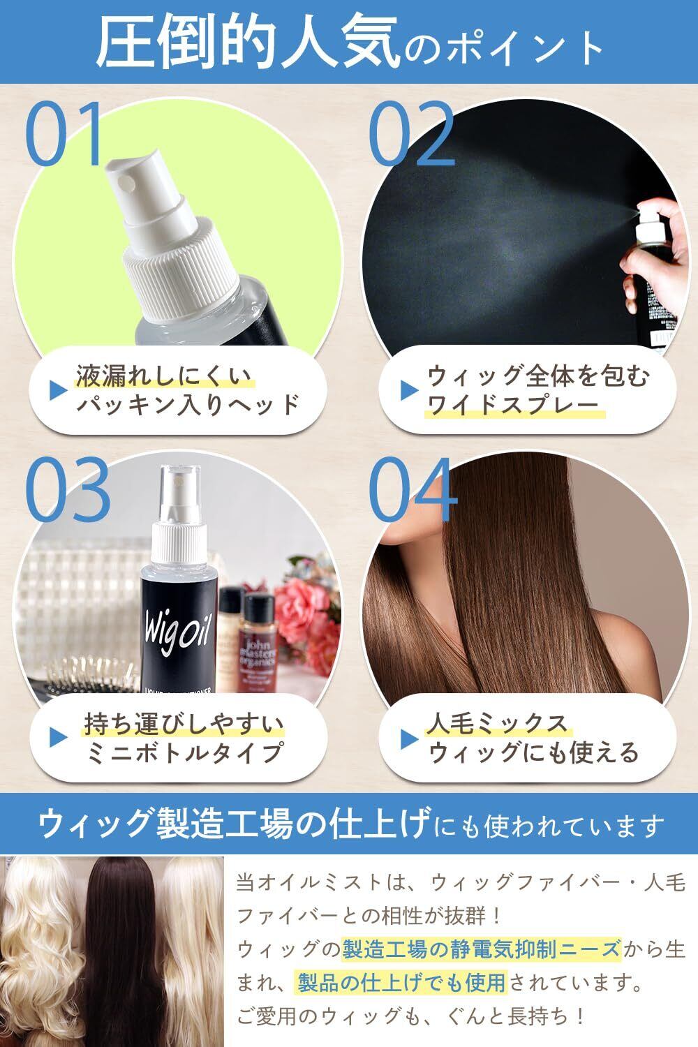 【ウィッグ工場から生まれたウィッグのためのオイル】 ドラッグストアや量販店で販売されている市販ヘアオイルの大半は、ポンプ式です。 そのため、ウィッグに使用するには使いづらいというデメリットがあります。 MilicaBooksウィッグオイルは、細かいミスト状のオイルだからウィッグのケアに最適です。 ウィッグ工場から生まれたウィッグのためのヘアケアオイルです。