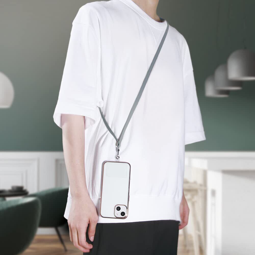 透明シートを挟むだけ! 全端末対応。端末とスマホケースの間に挟む透明シート同梱。長さ調節可能。ストラップ全長約140㎝(最長)。