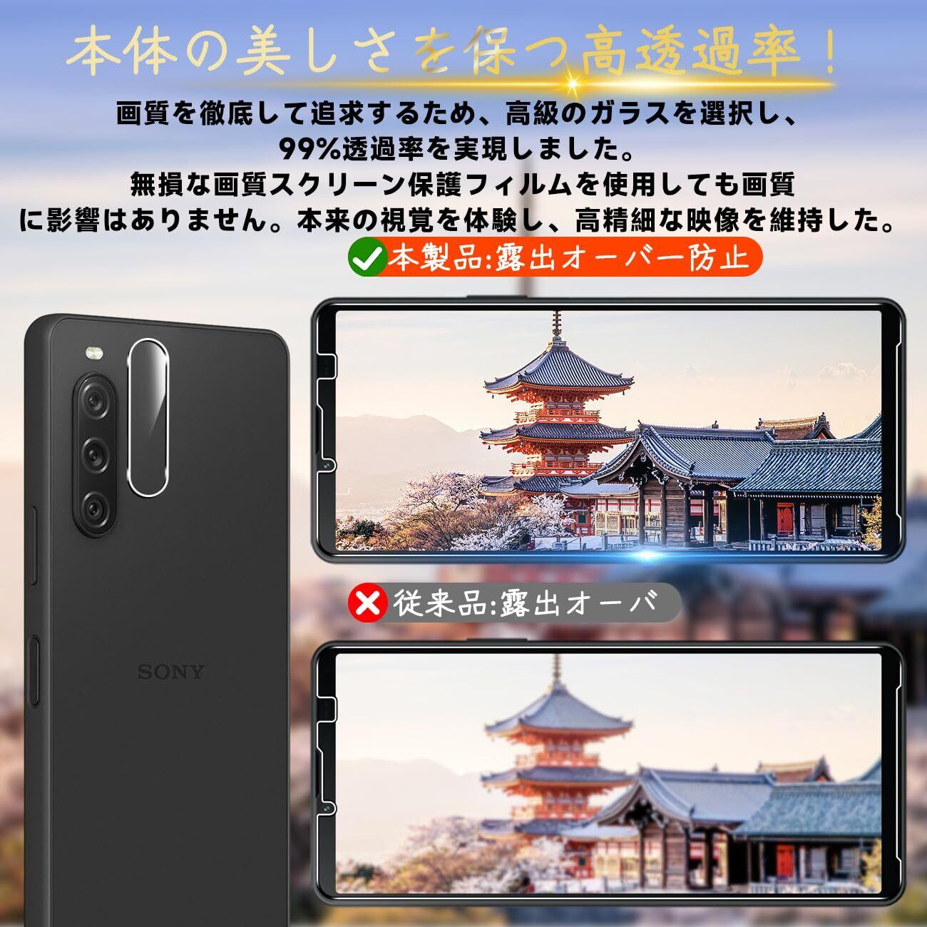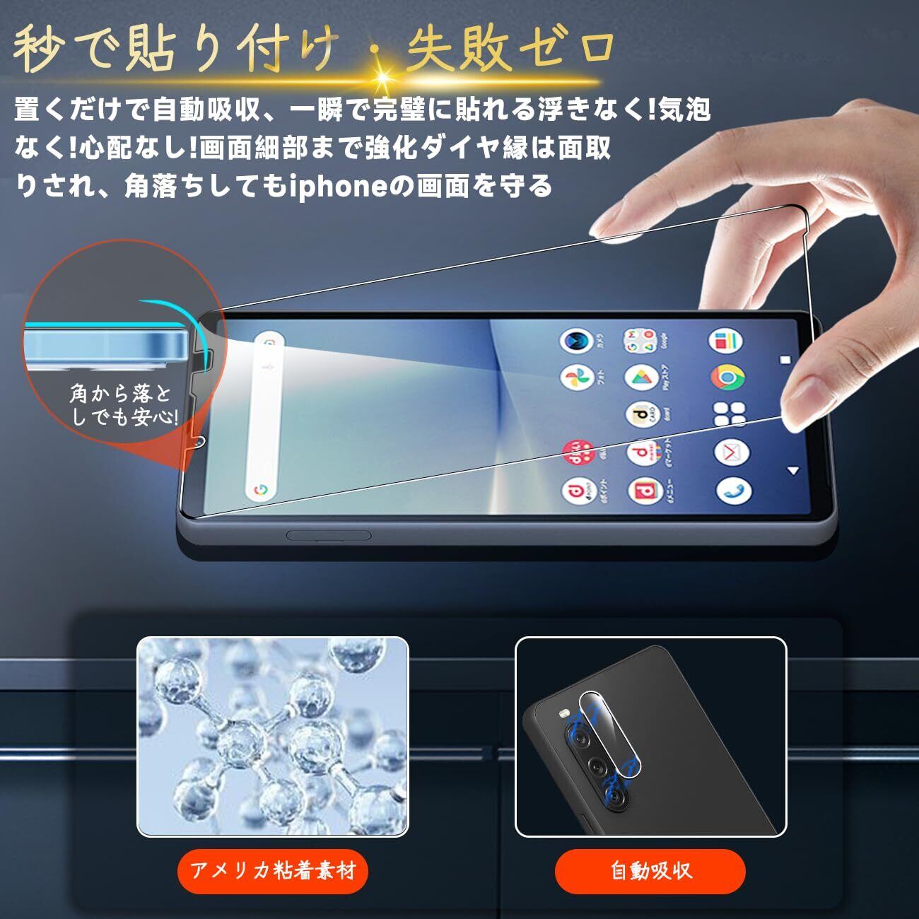 【専用設計·簡単に貼り付け】Sony Xperia 10 V SO-52D / SOG11 専用液晶画面保護ガラスフィルム。本商品は日本素材のAGC 旭硝子 素材を採用して作られております。フィルムのシリコン自己吸着層により、スチールフィルムを携帯電話に合わせて軽く置くだけで、気泡が入らないように簡単に取り付けられます。(重点説明:フロントカメラのカメラ穴についてですが、ほこり・異物などの堆積を防止するため、ガラスフィルムにカメラ穴を開けていません。Seninhiのガラスフィルム 、通過率は99.9%なので、フロントカメラの正常使用に全く影響が出ません。)*モデルによっ