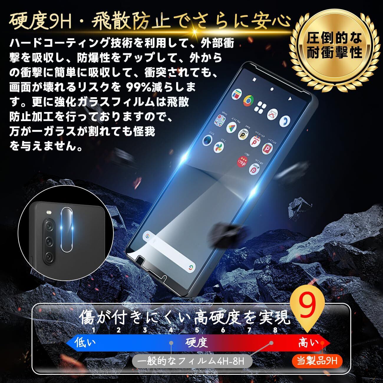 【高品質の材料の9H硬度】とレンズ保護フィルムはすべて旭硝子で作られており、スマホ保護フィルムの中で最高レベルの9H硬度に達しています、4.5時間以上の高温焼入れ処理を行い、スクリーンプロテクターの圧強度は 125mpa に達し、通常 ガラス の 5 倍になりました。しかもスクリーンプロテクターは衝撃を抑えるシリコンコーティングを内蔵しており、万が一ガラスが割れても、ガラスの破片が飛散しません。ハードコーティング技術は、衝撃を最小限に抑えて画面の破損を抑え、すり傷防止や指紋防止もしっかりとスクリーンを保護します。*大切な携帯電話の液晶画面を保護し、衝撃や表面のキズを防止します。