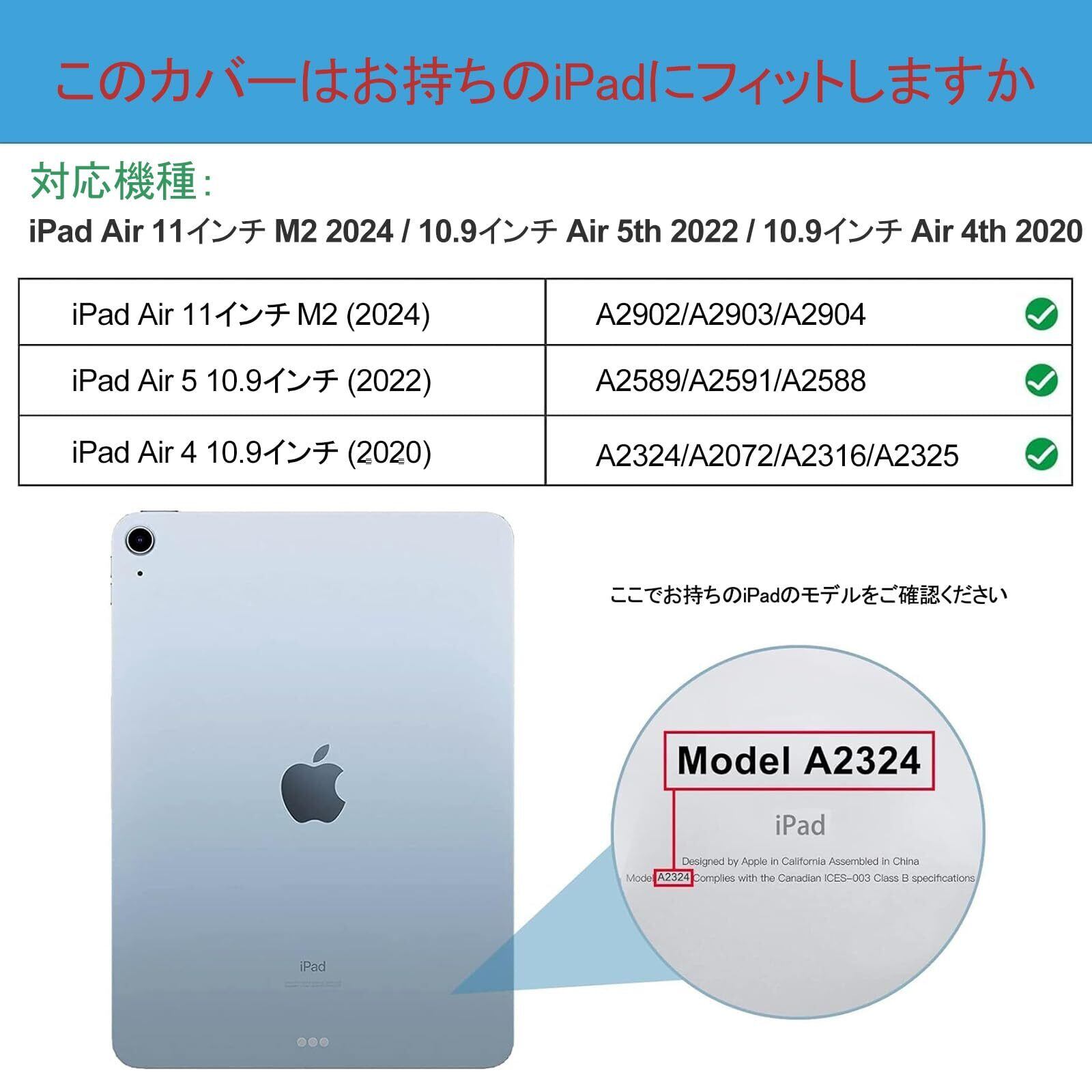 【適用機種】iPad Air 11インチ M3 2025、iPad Air 11インチ M2 2024(A2902 A2903 A2904)、iPad Air 第5世代 2022(A2588 A2589 A2591)、iPad Air 第4世代 2020(A2324 A2072 A2316 A2325) 10.9インチ、その他の型式に適用されません。ご購入前、お持ちのiPadのモデル番号をご確認いただきます。
