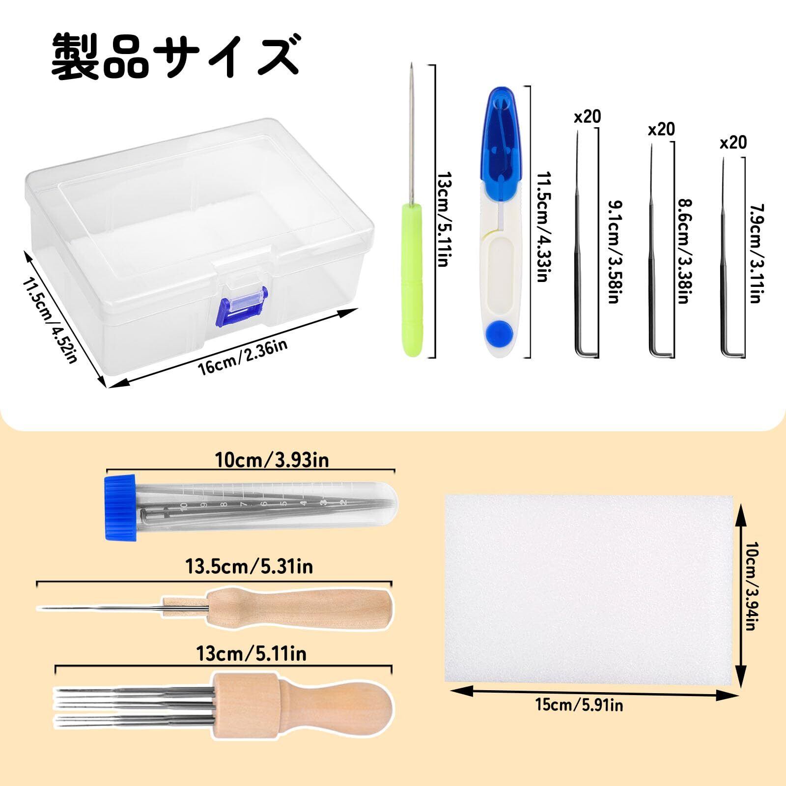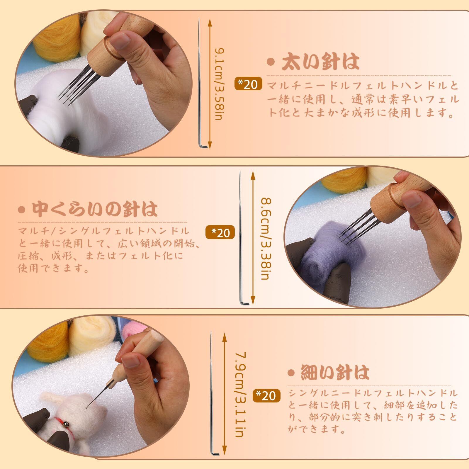 フェルトニードルキット: 3種類のサイズの羊毛フェルト針:20×9センチ、20×8.6センチ、20×7.8センチ。要件に応じたさまざまなオプション。太い針と仕上げ用の細い針がフェルトニードルセットに入っているので、細かい作品作りにも対応できます。